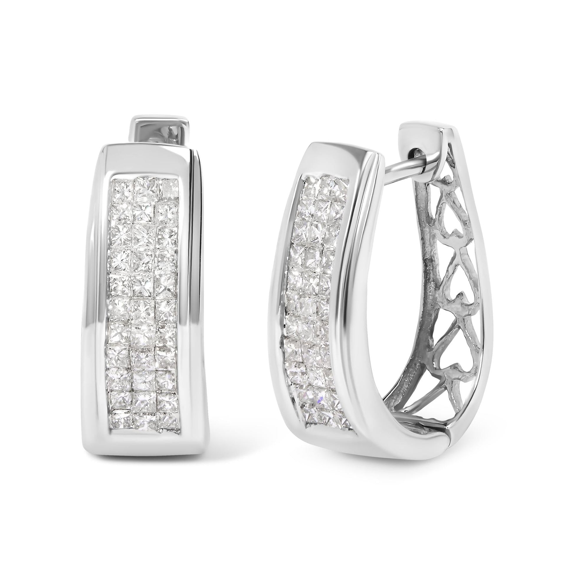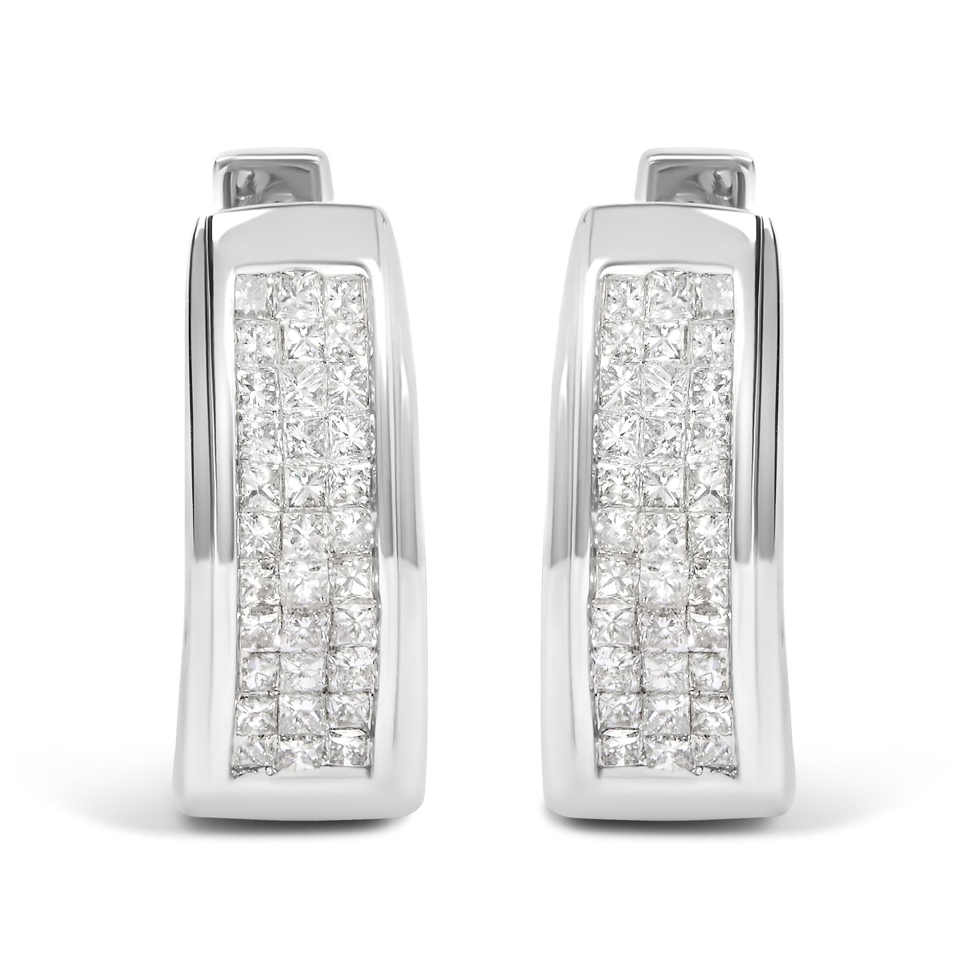 Experience the blend of unparalleled elegance and timeless sophistication with these impeccably crafted 14K white gold earrings. Imbued with a huggy hoop design, they clutch your earlobes with a delicate embrace, embodying a seamless fusion of comfort and grace. Radiating brilliance, the 1.0 carat total weight princess cut diamonds sparkle with an invisible set arrangement, allowing the natural H-I color and VS1-VS2 clarity of the stones to shine with an unblemished purity. Sourced naturally, each diamond presents an authentic touch of nature's wonder, further enhanced by a meticulous rhodium plating that promises enduring luster and longevity. Adding an element of surprise, the inner latticework reveals a delicate, unseen artistry, whispering tales of masterful craftsmanship.