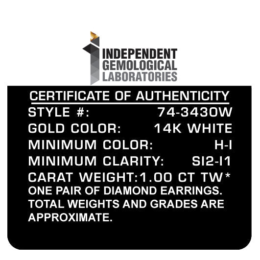 Two gorgeous near-colorless white diamonds sit in a prong setting on these sparkling stud earrings. Crafted in solid 14k gold, these diamond stud earrings feature a high polish finish. These stunning gold earrings feature round brilliant-cut diamonds, and the timeless four-prong settings are sure to keep the gemstones in place. These simple stud style earrings are subtle enough for casual affairs but sparkle in formal settings as well. Coordinate these earrings with your favorite diamond necklace or other diamond jewelry to create a complete elegant ensemble. Sizes under 1.0 carats total weight have pushback closures with notched friction posts, while sizes 1.0 Cttw & up have screw backs. These pierced earrings will stay securely on your ears for comfortable, worry-free wear all day long.