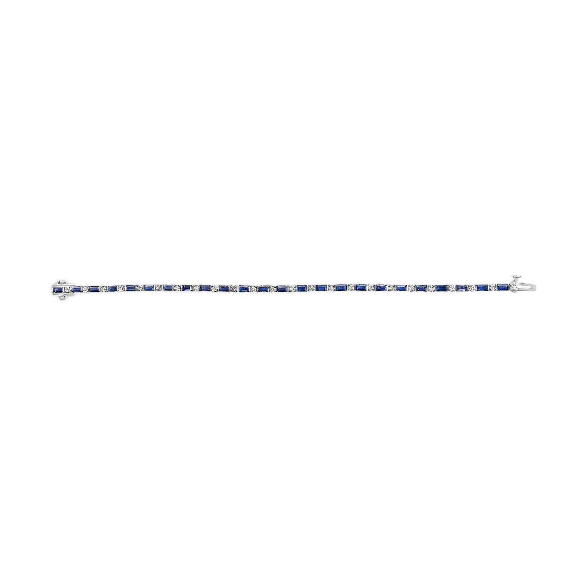 Discover the epitome of elegance with this exquisite 14K white gold tennis bracelet, a marvel of craftsmanship and style. Rhodium-plated for added durability and brilliance, this 7-inch masterpiece draws the eye with its luxurious alternating design. It showcases a harmonious line-up of natural, untreated diamonds and enhanced blue sapphires, secured by a reliable box clasp and safety latch. Each diamond, ensconced in four prongs, radiates light with an I-J color and SI2-I1 clarity, enhancing the vivid, treated hues of the channel-set, baguette-cut sapphires. Designed for both grand events and everyday sophistication, this bracelet promises to be a timeless addition to any jewelry collection, symbolizing both strength and beauty.