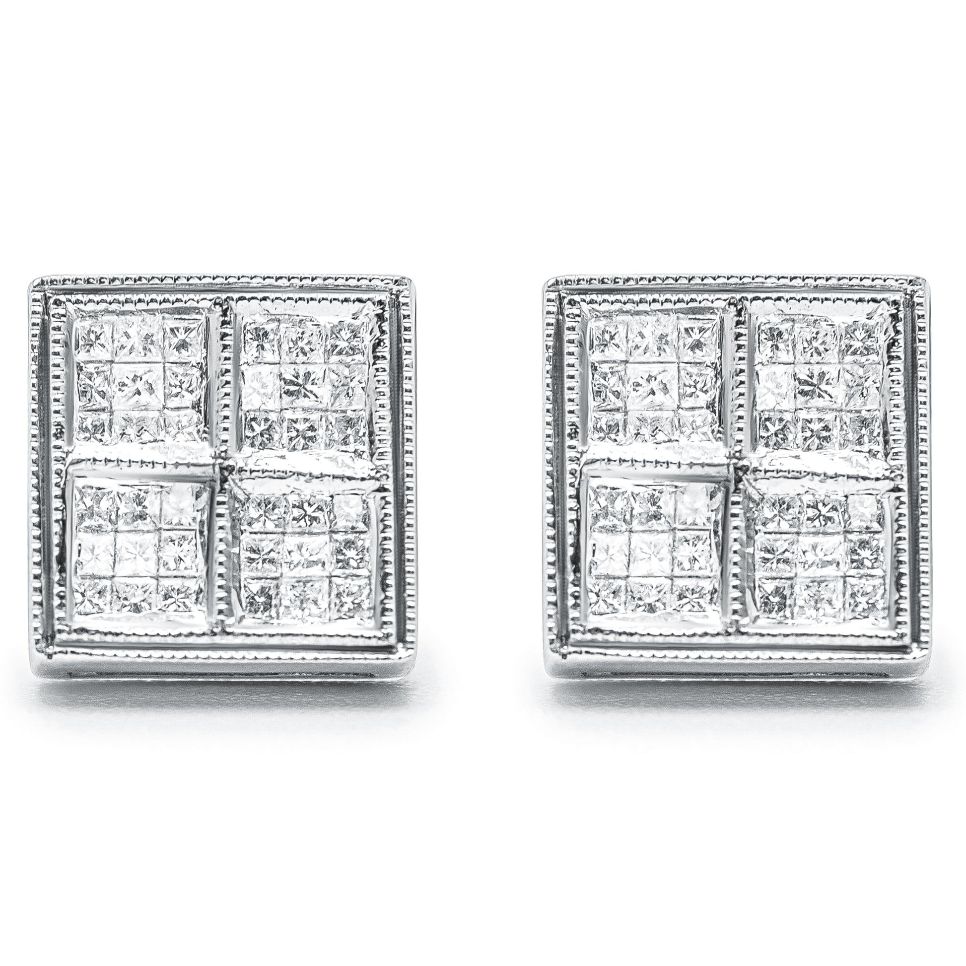 A unique twist on a classic design, these 1/2 c.t. studs are beautifully crafted in 14k white gold. Four square clusters of natural, princess-cut diamonds make up the design of these stunning earrings. This piece has a push back mechanism for a safe and secure fit on your ears. You will love how these composite diamond studs shine and add a touch of glamour to your look!