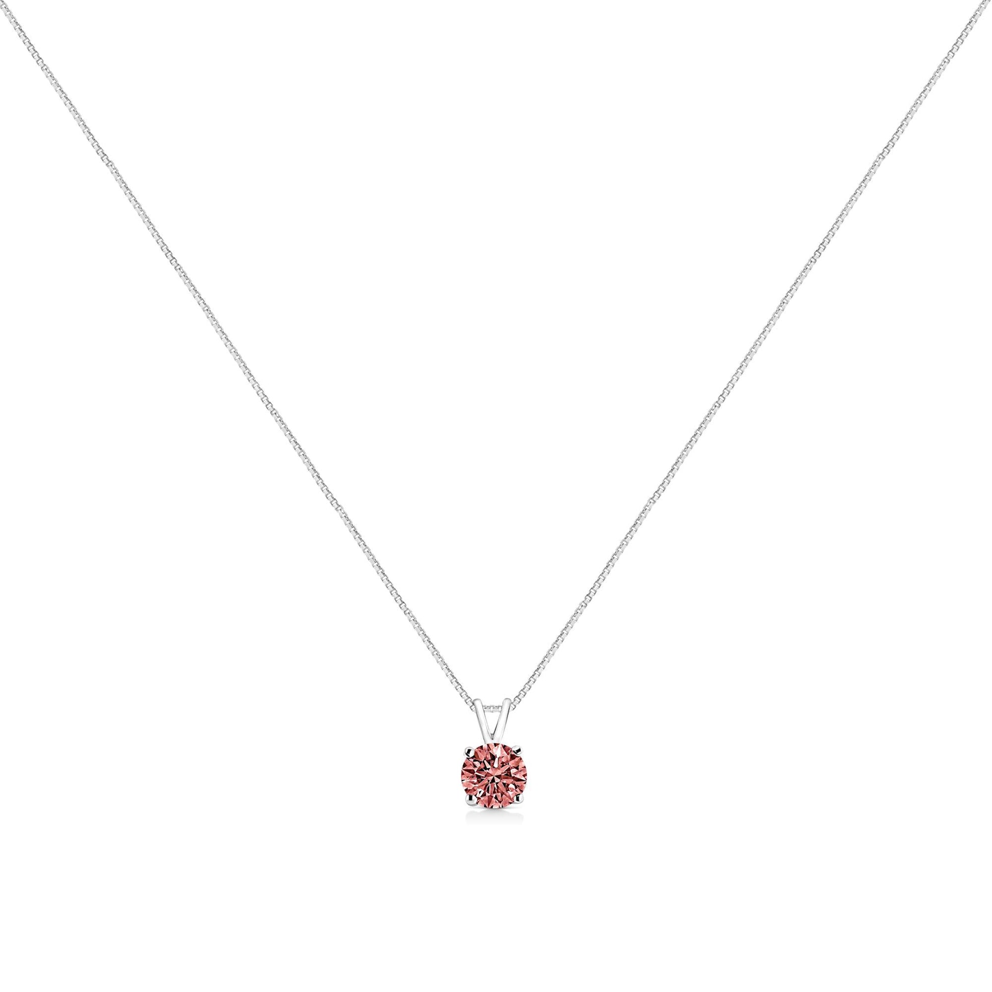 This understated yet dazzling diamond-forward piece the perfect way to highlight every big occasion, transition, and personal achievement in your life. This exquisitely simple design features your choice of either 1/4 or 1/2 cttw round diamond solitaire in a classic 14kt white gold four prong setting. Choose from either pink, blue or white diamonds for the perfect gift. The solitaire hangs from a v-shaped split bail on an 18" box chain with spring ring clasp. This is sure to become an everyday favorite; your future self will thank you!