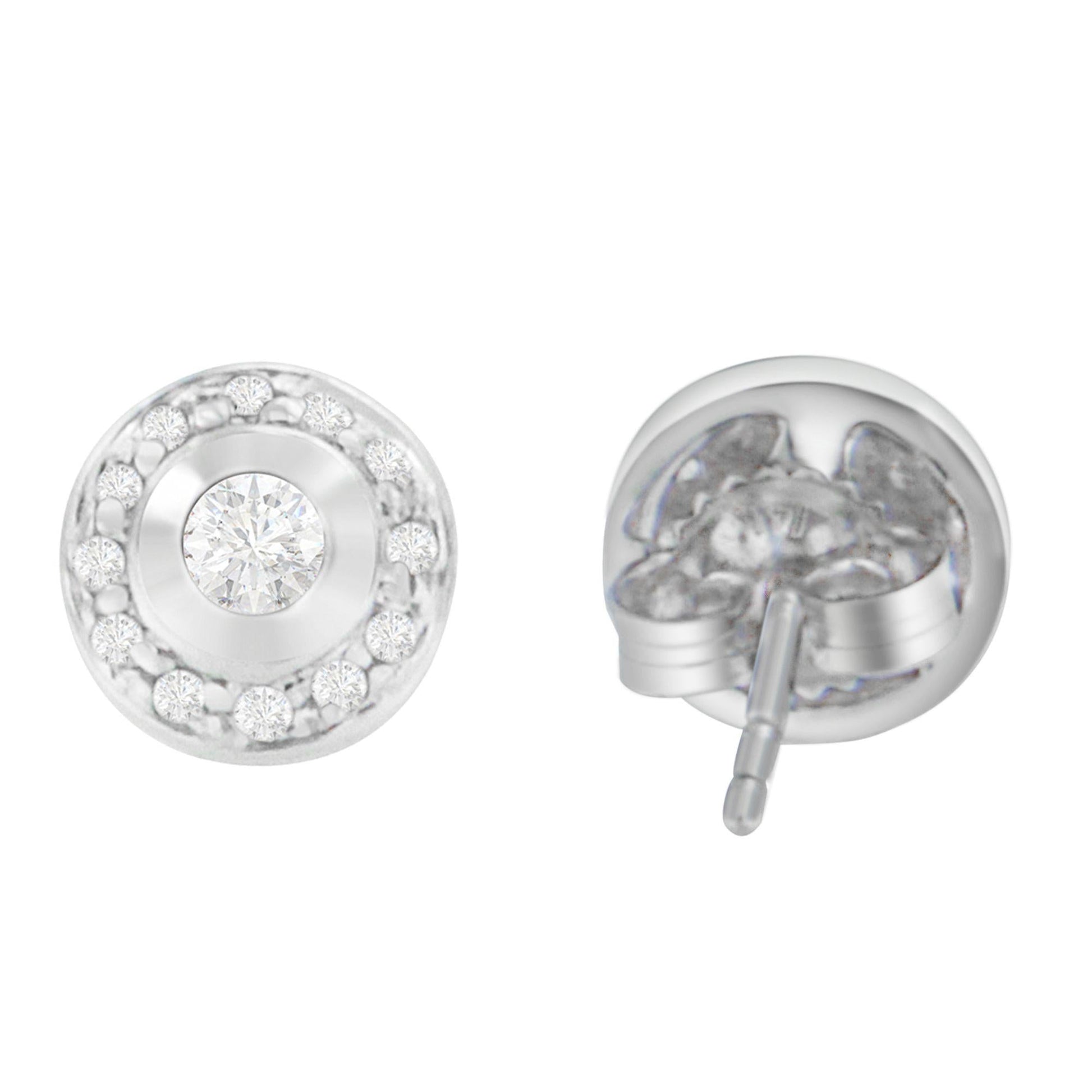 Nothing is quite so glamorous as a pair of round diamond studs. This pair, featured in 14k white gold, showcases a central prong set round-cut diamond embraced by a circle of smaller bezel set diamonds, separated by a ring of highly polished precious metal. Secured with push backs.