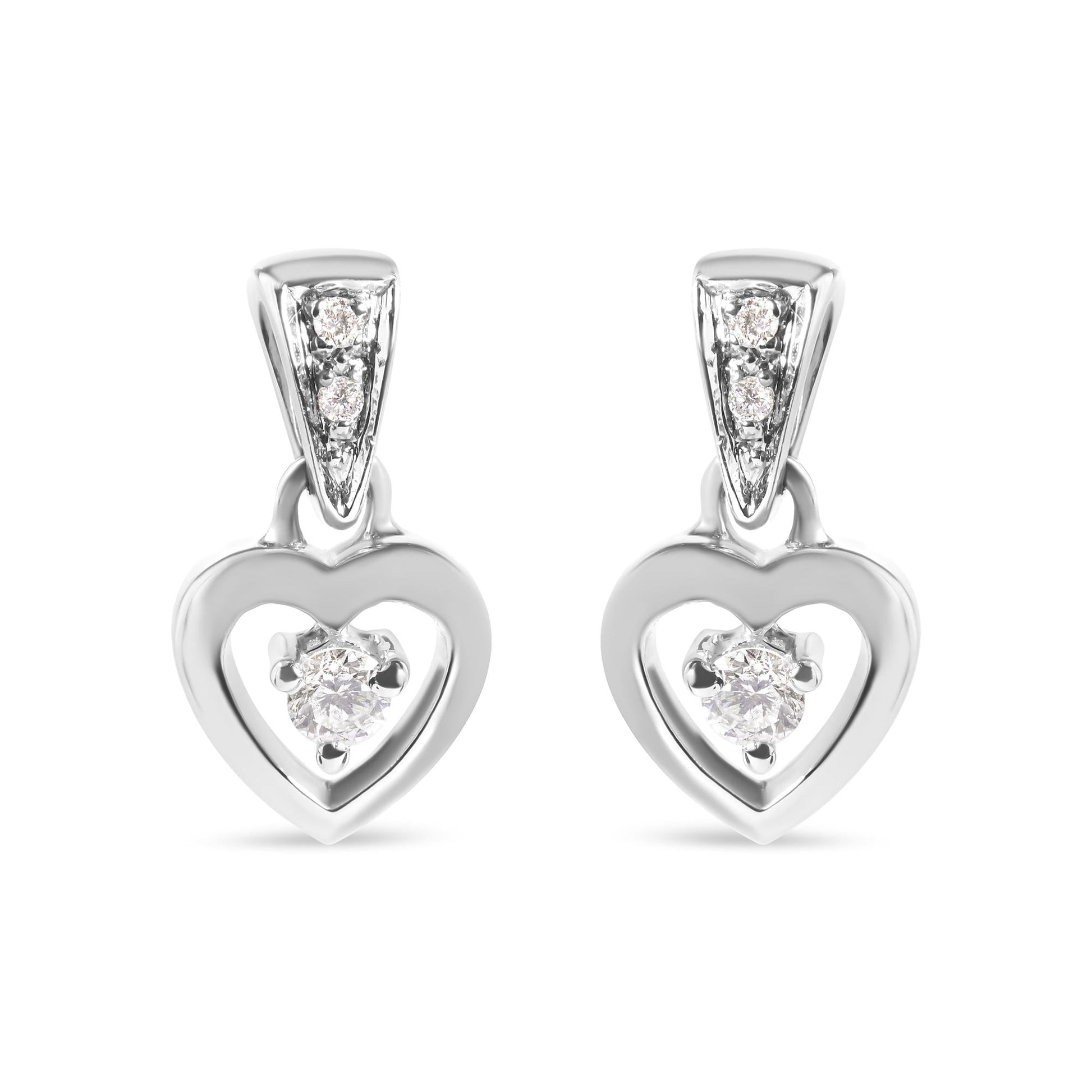 You will fall in love with these beautiful dangle heart stud earrings. Fashioned in 14k white gold, they feature 1/6 ct TDW of twinkling round cut diamonds. A cut out of a heart holds in its center a round cut diamond and delicately dangles from a triangular stud inlaid with additional diamonds. The earrings secure with a push back mechanism.