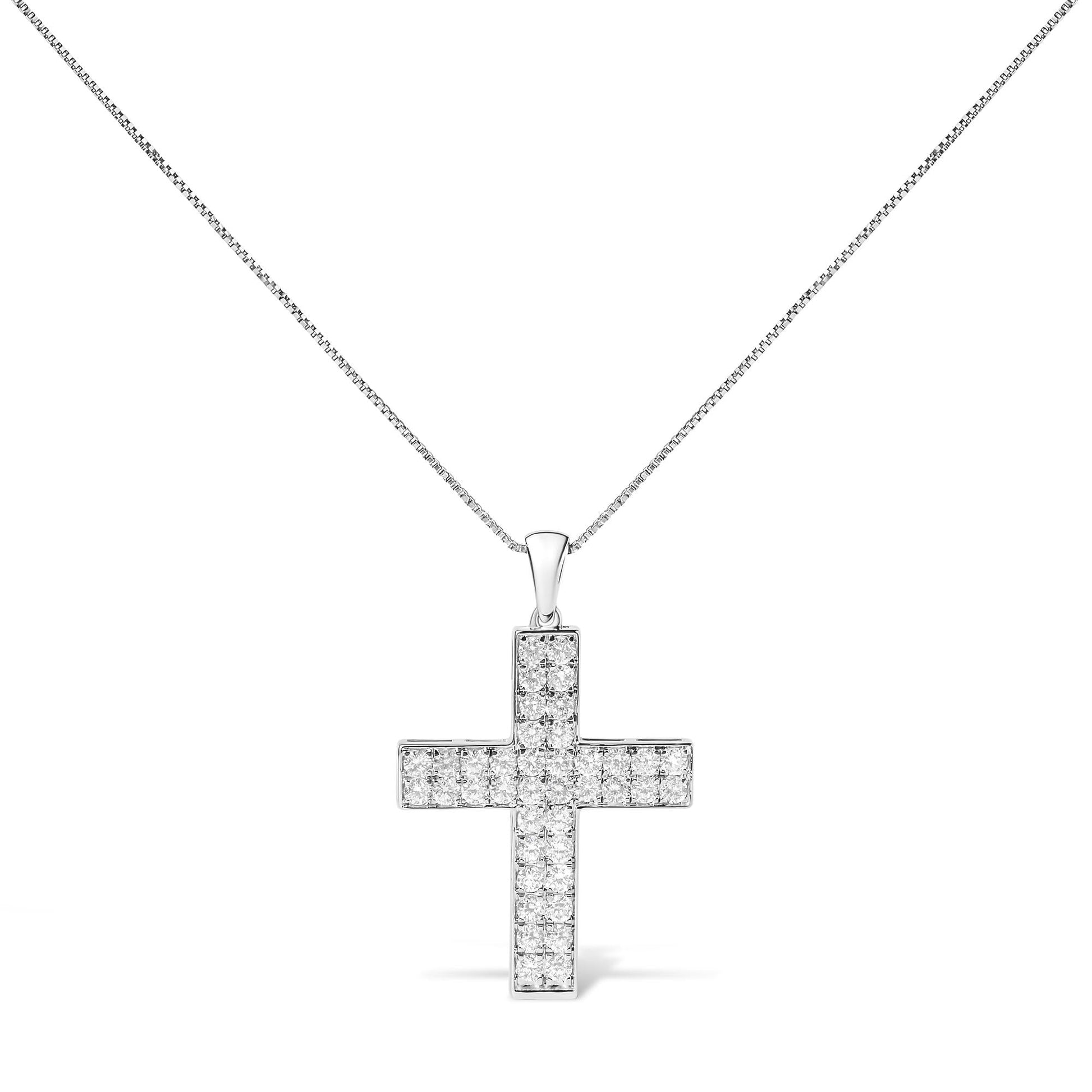 Embrace divine elegance with this radiant 14K white gold cross pendant necklace, rhodium-plated to amplify its durability and lustrous appeal. Painstakingly inlaid with 2.0 carats of lab-grown diamonds, each gem sparkles with an F-G color and VS1-VS2 clarity, offering a crystalline brilliance that mirrors your faith and grace. The cross spans an ethereal 1.5 inches, symbolizing devotion in its most luxurious form. Suspended on an 18-inch box chain secured by a spring ring clasp, this celestial piece rests gently against your chest, a constant reminder of steadfast belief and exquisite craftsmanship. Ideal for both daily inspiration and as a statement of elegance at special events, this necklace encapsulates a timeless beauty designed to transcend generations.