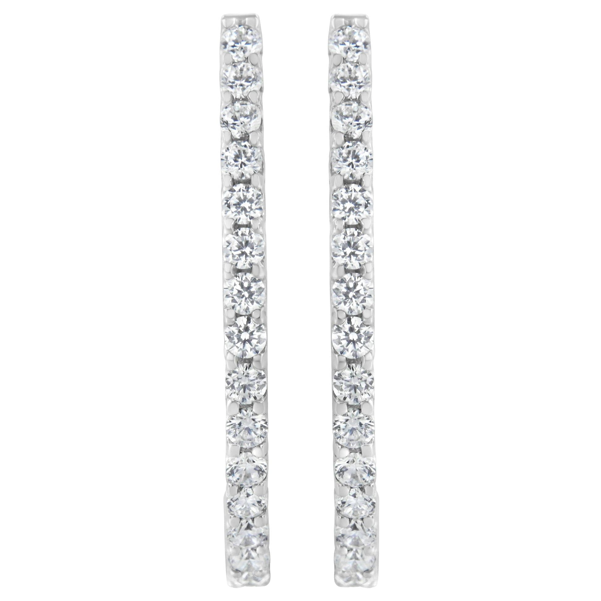 You will fall in love with these unique oblong hoop earrings. A must have for any serious jewelry collection, these 14K white gold earrings boast an impressive 2.0 carat total weight of diamonds with 30 individual stones. The hoops have round, brilliant cut diamonds in shared four prong settings lining the outside face of the hoops. The hoops are hinged for ease of wear and have secure leverback closures. These bold oval shaped hoop earrings make a great gift for any special occasion! Whether worn for daytime glamour or evening sparkle, these earrings are gorgeously versatile. Give her a gift that will perfectly complement her favorite ensemble.