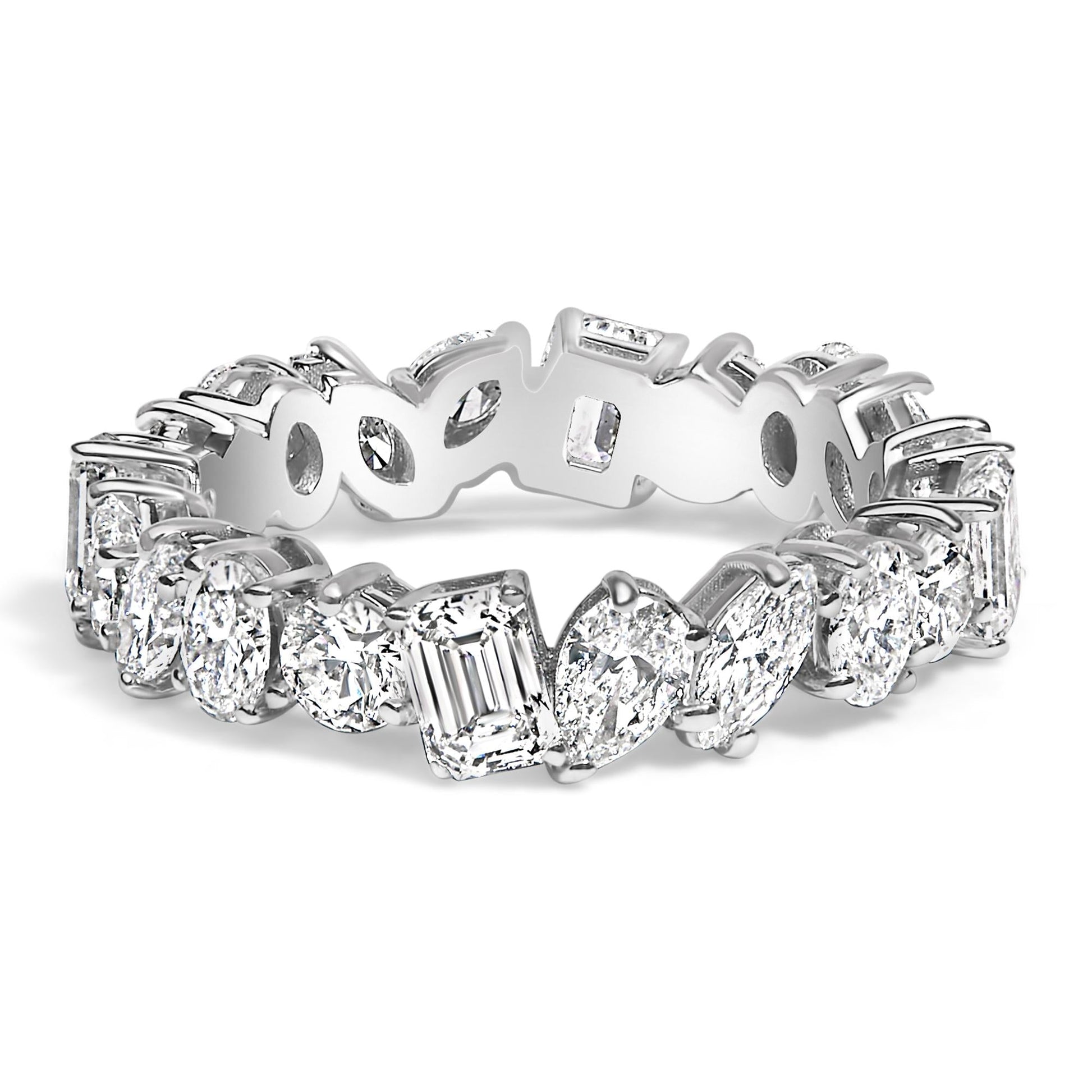 Encircle your finger with the symphony of sparkle that is this 14K white gold eternity band, where luxury meets cutting-edge science. Each lab-grown diamond, meticulously selected and artfully arranged in an array of mesmerizing shapes oval, round, marquise, pear, and emerald is a testament to modern craftsmanship and sustainable beauty. Plated in shimmering rhodium, this ring glows with a radiance that captures the essence of eternal love and unending commitment. The prong settings not only secure each precious stone but also enhance their collective brilliance, ensuring that every gesture you make casts a dance of light. Perfect for those who cherish elegance and seek to tread lightly on the earth, this ring transforms a classic symbol of devotion into a contemporary masterpiece.