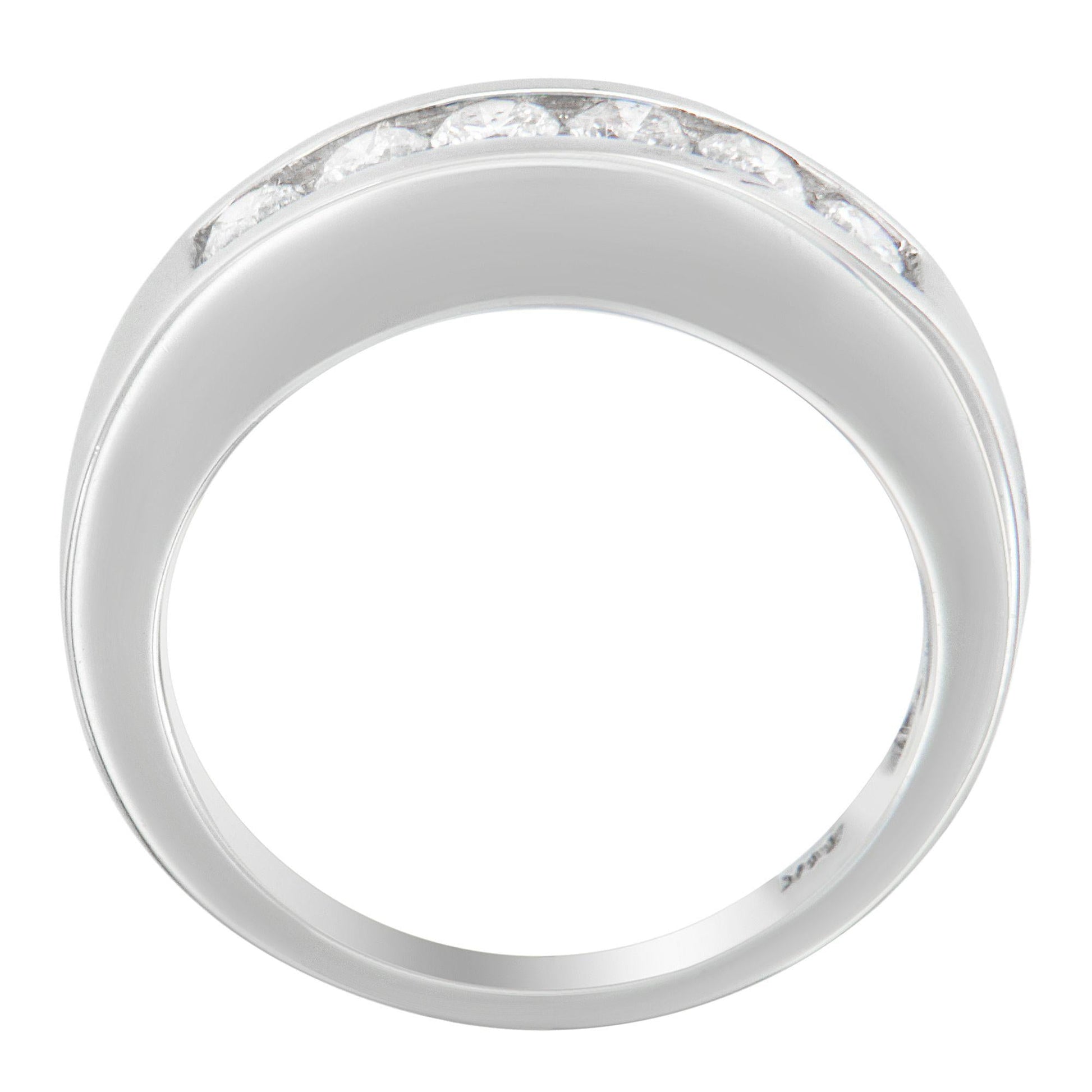 Bring more sophistication and style to your party look with this wonderful diamond band. Crafted out of 14k white gold, this fashion ring is lined with dazzling round-cut diamonds. Framed in channel settings, these diamonds are so captivating that it can fetch the attention of every onlooker.