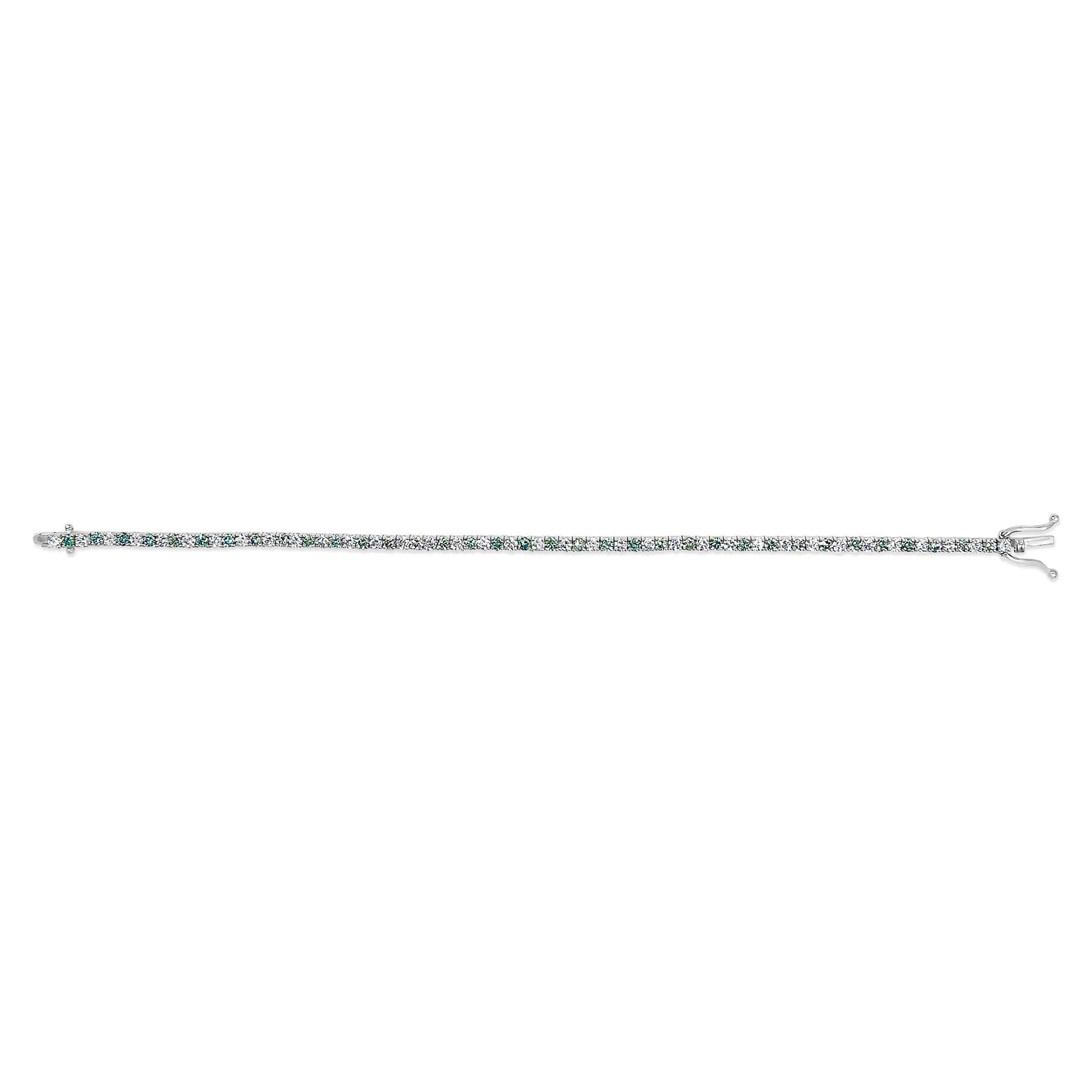 Immaculately crafted to adorn your wrist with a touch of timeless elegance, this bracelet boasts lab-grown diamonds cascading in an exquisite balance of icy whites and deep blues. Encased in dazzling 14K rhodium-plated white gold, the shimmering 4.0 carats of round brilliant-cut gems radiate unmatched clarity and color. The deliberate alternating pattern captivates the eye, while each diamond, secured by precise four-prong settings, dances beautifully in the light. A reliable box clasp with a safety latch promises secure wear. Perfectly sized at 7 inches, it offers a seamless fit for a sophisticated evening or a chic daytime look. Elevate your jewelry collection with this ethereal creation, symbolizing innovation and charm through its lab-grown origins.
