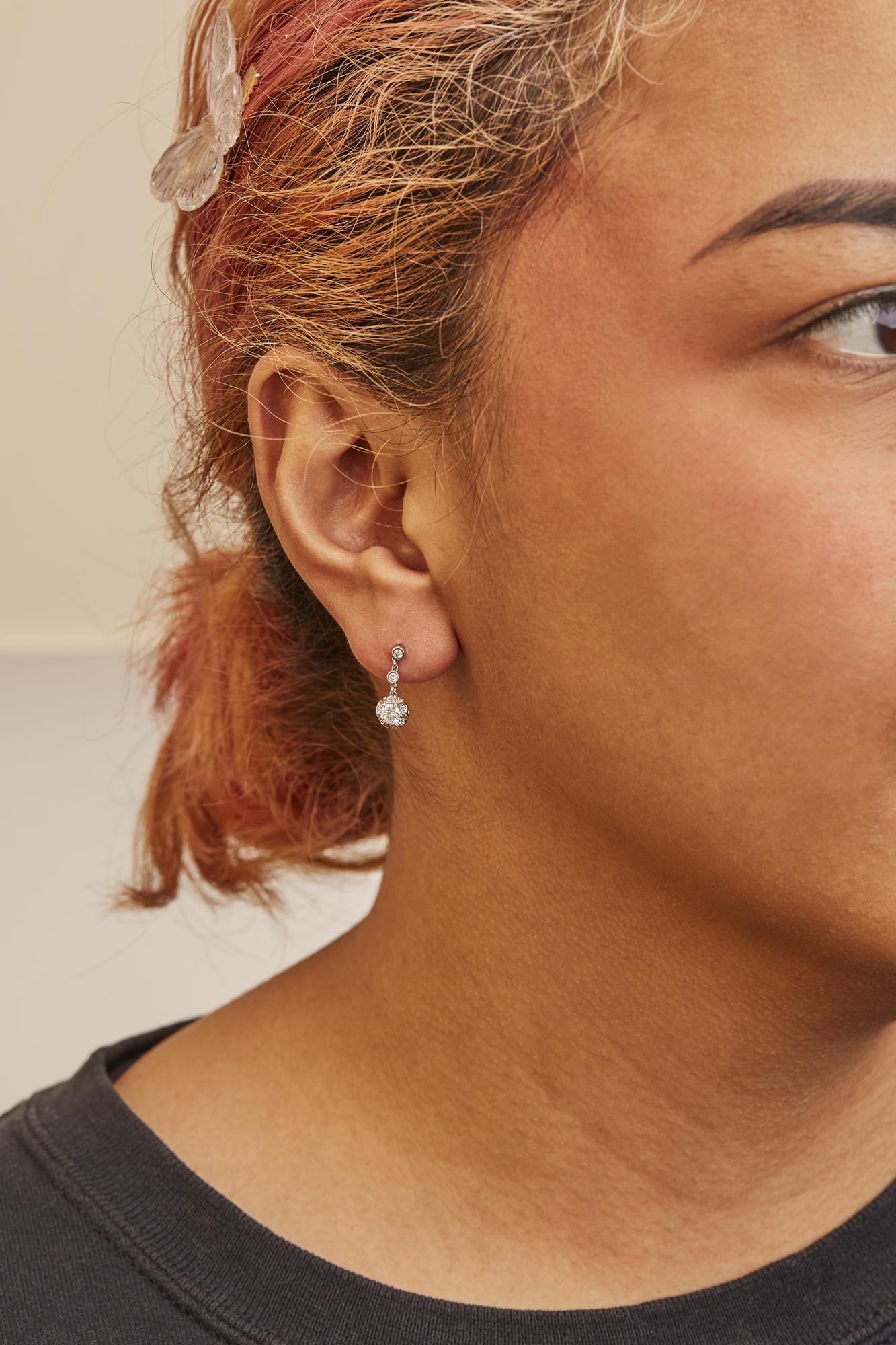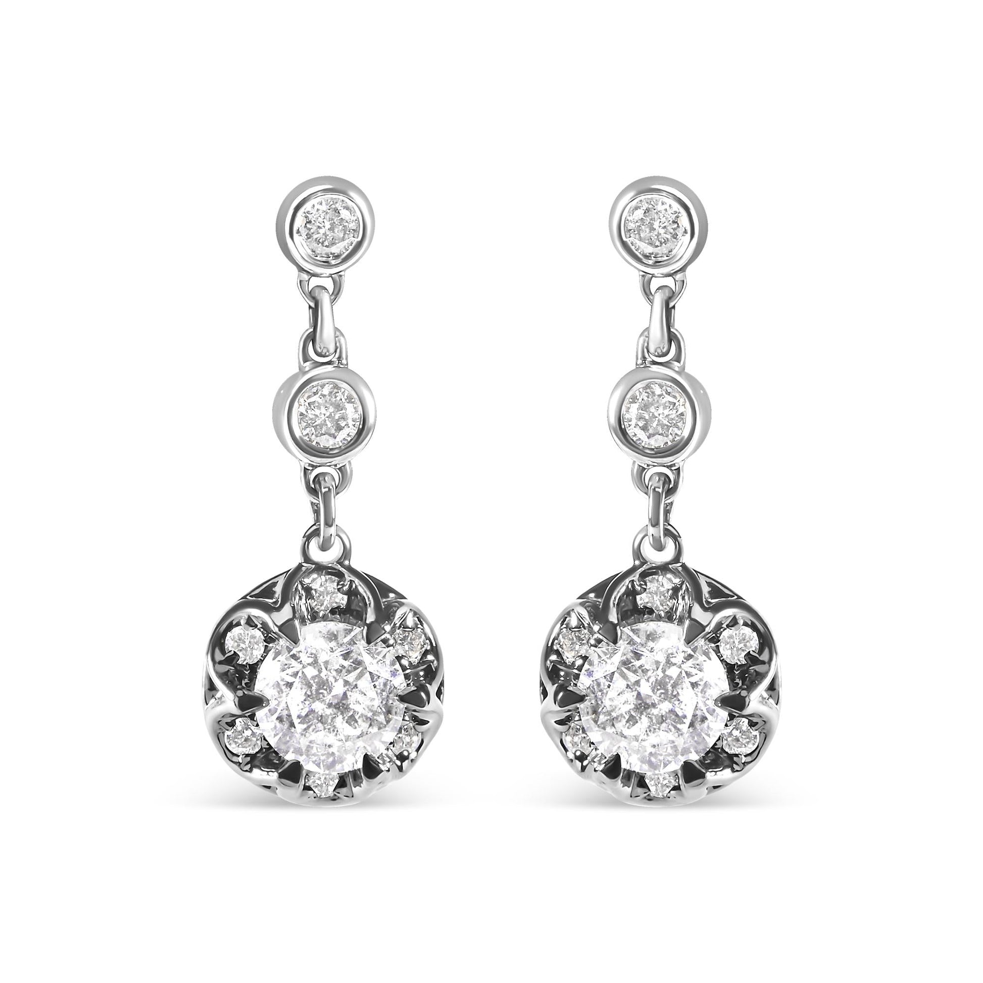 Indulge in the luxurious beauty of these 14k White Gold Diamond Halo Drop and Dangle Earrings. The exquisite design features a stunning array of 18 natural round diamonds, totaling 5/8 cttw. The diamonds are prong-set in a halo formation, highlighting their I-J color and I1-I2 clarity. The drop earring stud design is both elegant and versatile, perfect for any occasion. The push back earring findings ensure a secure and comfortable fit. These earrings are a must-have for any fashion-forward woman who desires to add a touch of glamour to her look. Elevate your style with these diamond-studded beauties.