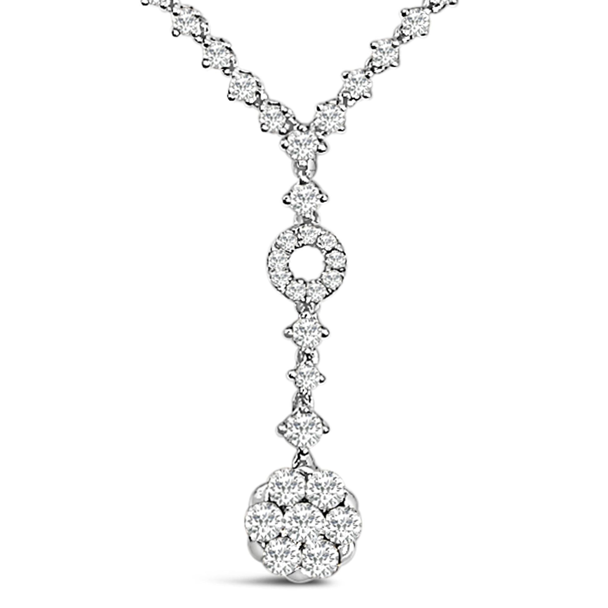 Immerse yourself in the splendor of this exquisite 14K gold necklace, where elegance meets brilliance in a harmonious design. Encased in a rhodium-plated white gold finish, this jewelry piece captivates with its captivating V-shape adorned by a plethora of small, natural diamonds that dazzle with an H-I color and an SI1-SI2 clarity. Its graceful composition flows into a sheer vertical drop, featuring an entrancing circular diamond cluster that draws the eye downward to a larger, more resplendent diamond arrangement. The piece rests delicately along an 18-inch cable chain, secured by a robust lobster claw clasp, promising both comfort and unparalleled sophistication.