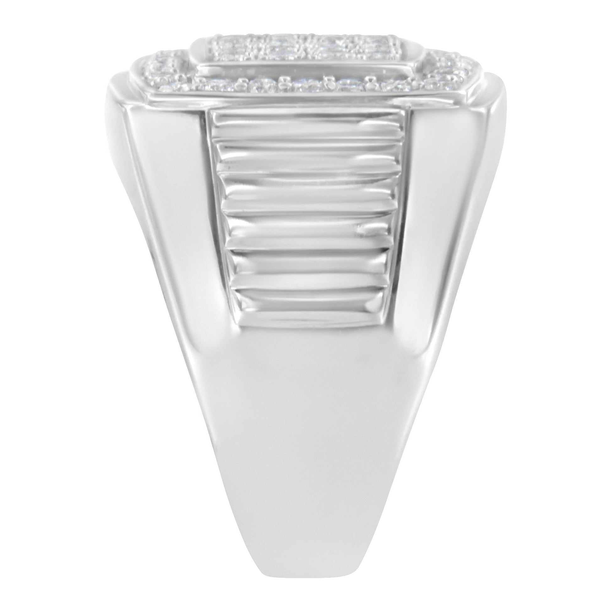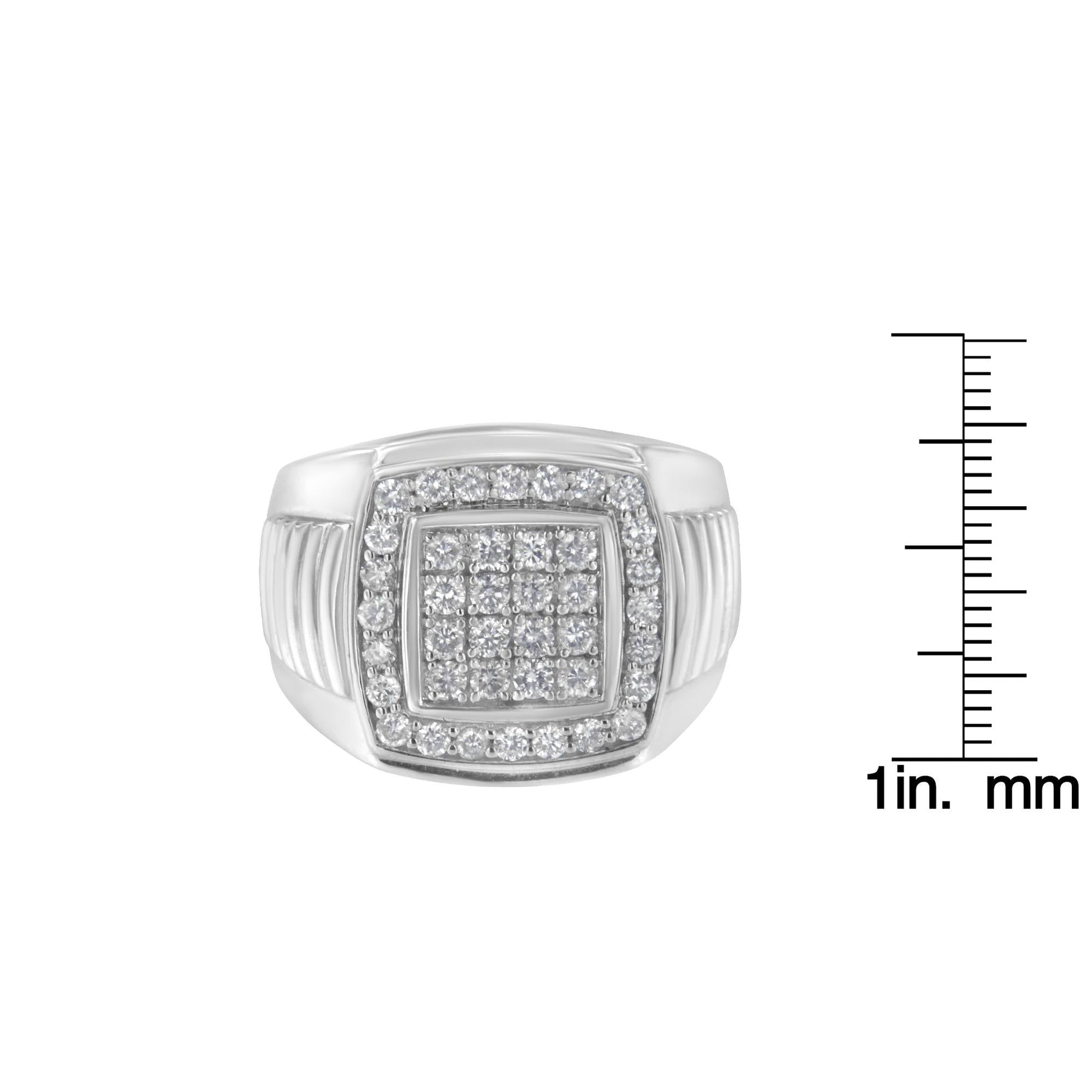 This 14 karat white gold men's band features a central square cluster of round diamonds surrounded by a squared halo of diamonds. The wide band is accented with a fluted design. It has a total diamond weight of 1 carat.