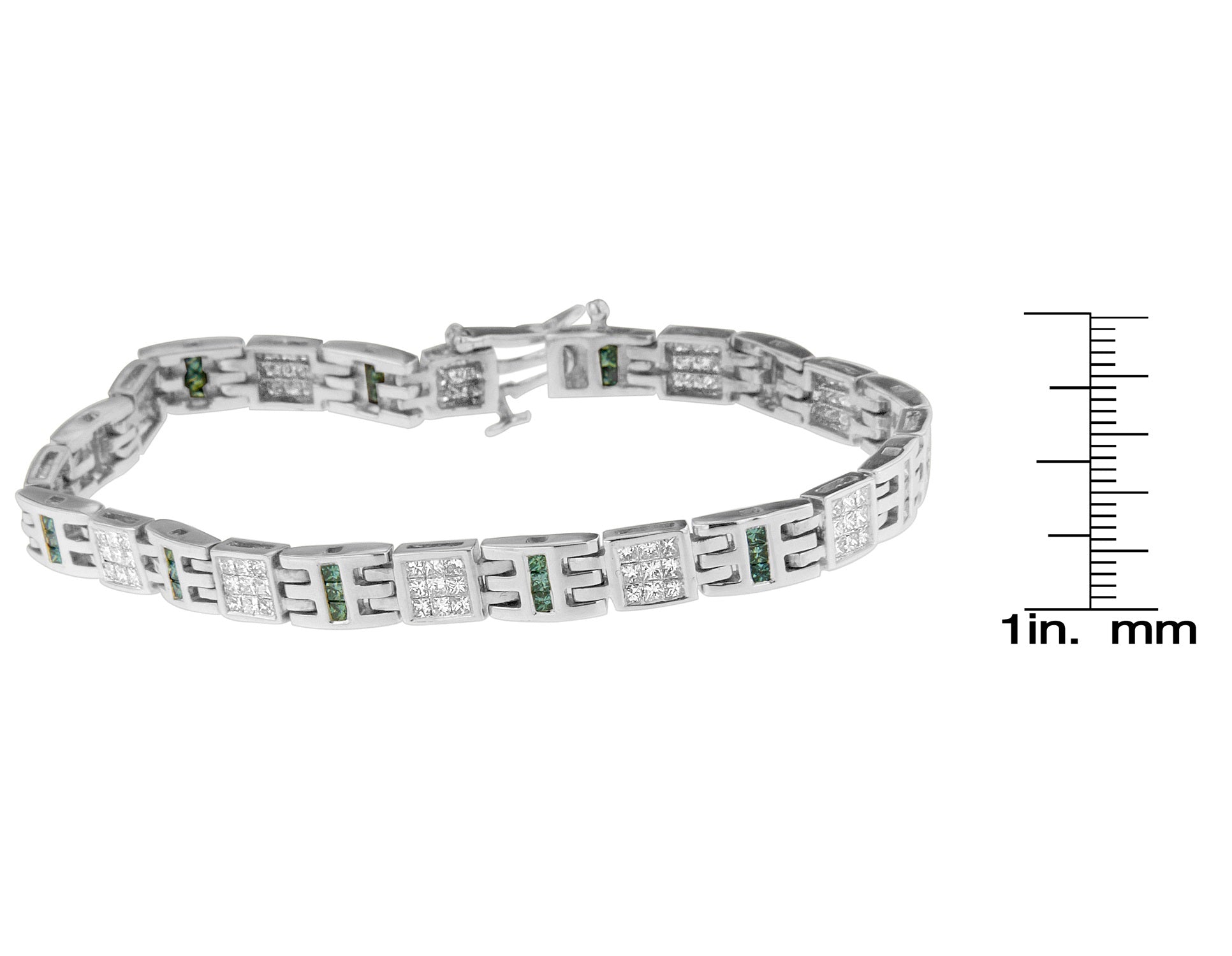 Oh-so-neat, chic, and sleek, this interlinked tennis style bracelet will take her look to a new level. Crafted in 14 karats white gold, the intriguing design features a dazzling chain setting arrangement of princess cut diamonds in blue and white. Polished to shine high, it makes a timeless accessory to your jewelry collection.