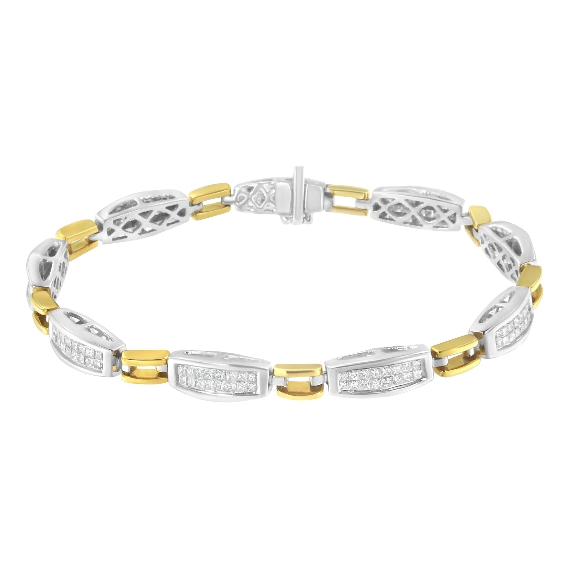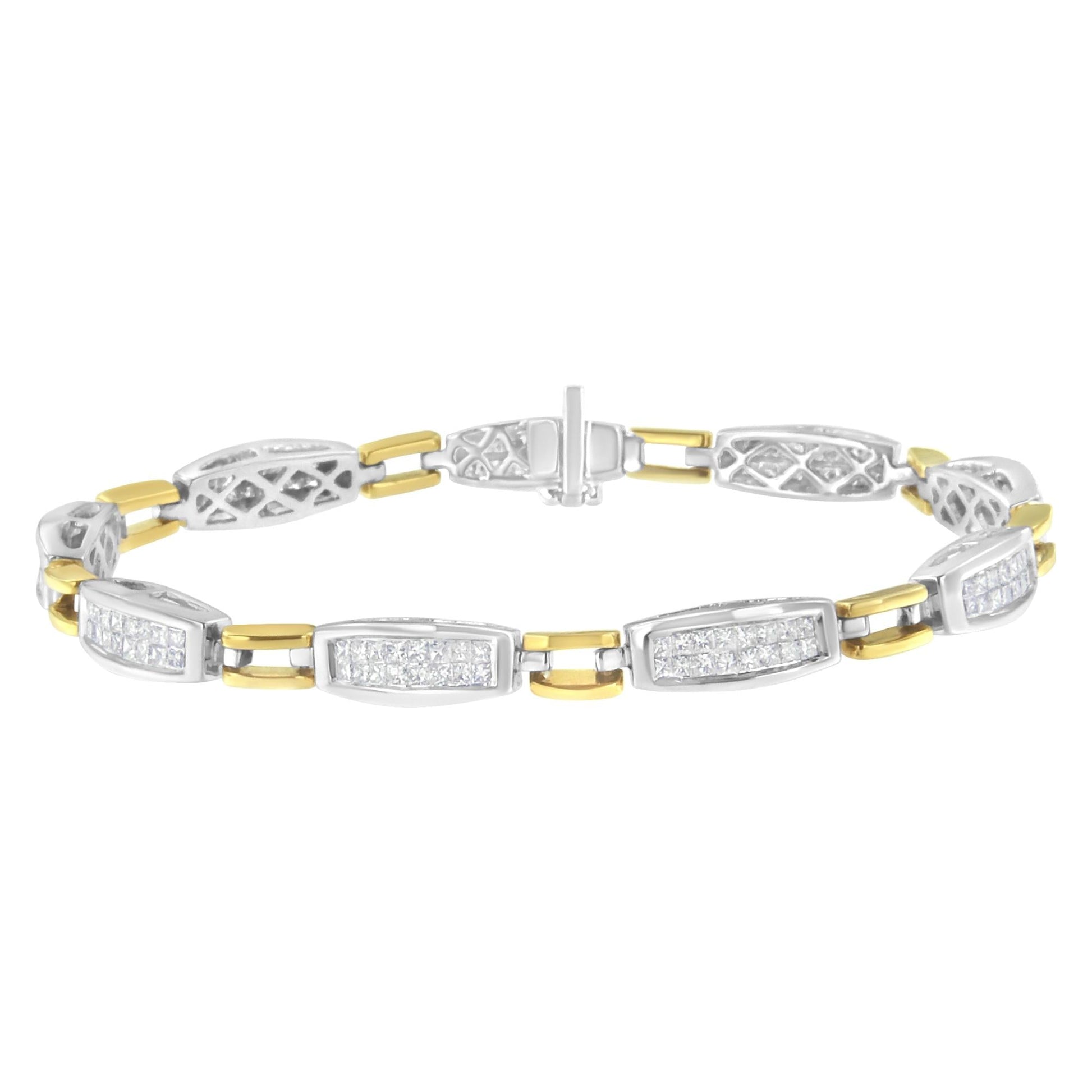 Elegant and timeless, this gorgeous two tone 14K yellow and white gold link bracelet features 2.0 carat total weight of princess cut diamonds with a whopping 144 stones in all. The tennis bracelet features yellow gold equal sign shaped links alternated with tapered white gold links inset with two rows of invisible set, princess cut diamonds. This authentic design is crafted of real 14 karat gold, a precious metal that will keep a tarnish-free shine for years to come. The 7” bracelet fastens with a box with tongue clasp. This sweet bracelet makes a perfect Valentine's Day gift or for any special occasion. It's a classic and feminine piece she'll want to show off every day. Whether worn for daytime glamour or evening sparkle, this bracelet is gorgeously versatile. Give her a gift that will perfectly complement her favorite ensemble.