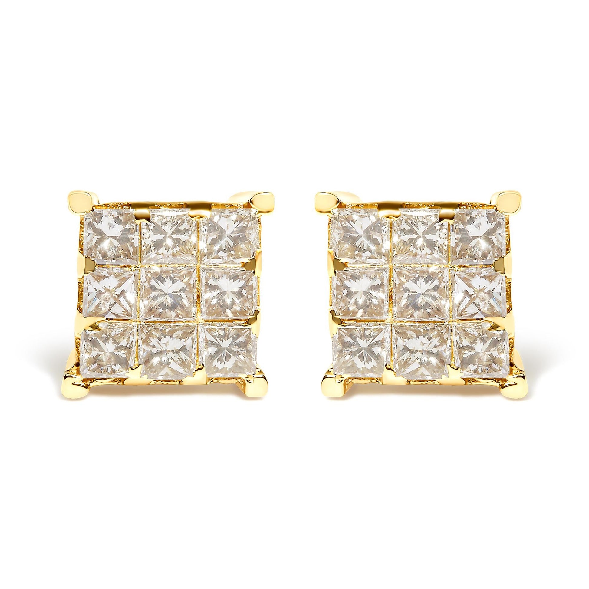14K Yellow Gold 1 1/2 Cttw Invisible Set Princess-Cut Diamond 9 Stone Square Stud Earrings (J-K Color, SI2-I1 Clarity)