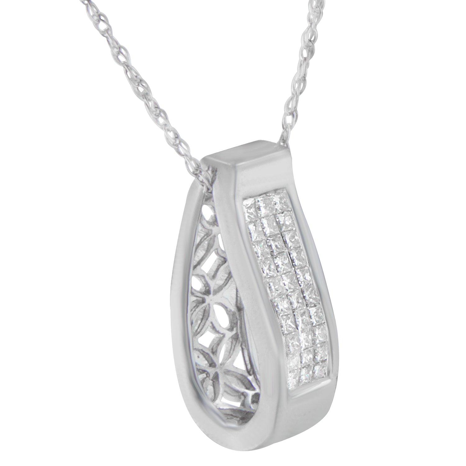 Created in a modern, contemporary design, this diamond vertical bar block pendant necklace radiates class and glamour. The minimalist bar block profile is juxtaposed by glamorous, linear princess cut diamonds in an invisible setting that perfectly showcases the sparkling stones and the precious metal of the pendant. An elegant openwork filigree motif graces the back of the pendant, illustrating an ornate and timeless design concept with beauty that shines from every angle. This sophisticated pendant necklace is made of genuine 14k yellow gold, a metal that will stay tarnish free for years to come! The 1/2 cttw diamonds are of an approximate H-I color and SI2-I1 clarity. The contemporary yet classic 18" box chain complements any neckline beautifully, finished with a spring ring clasp.