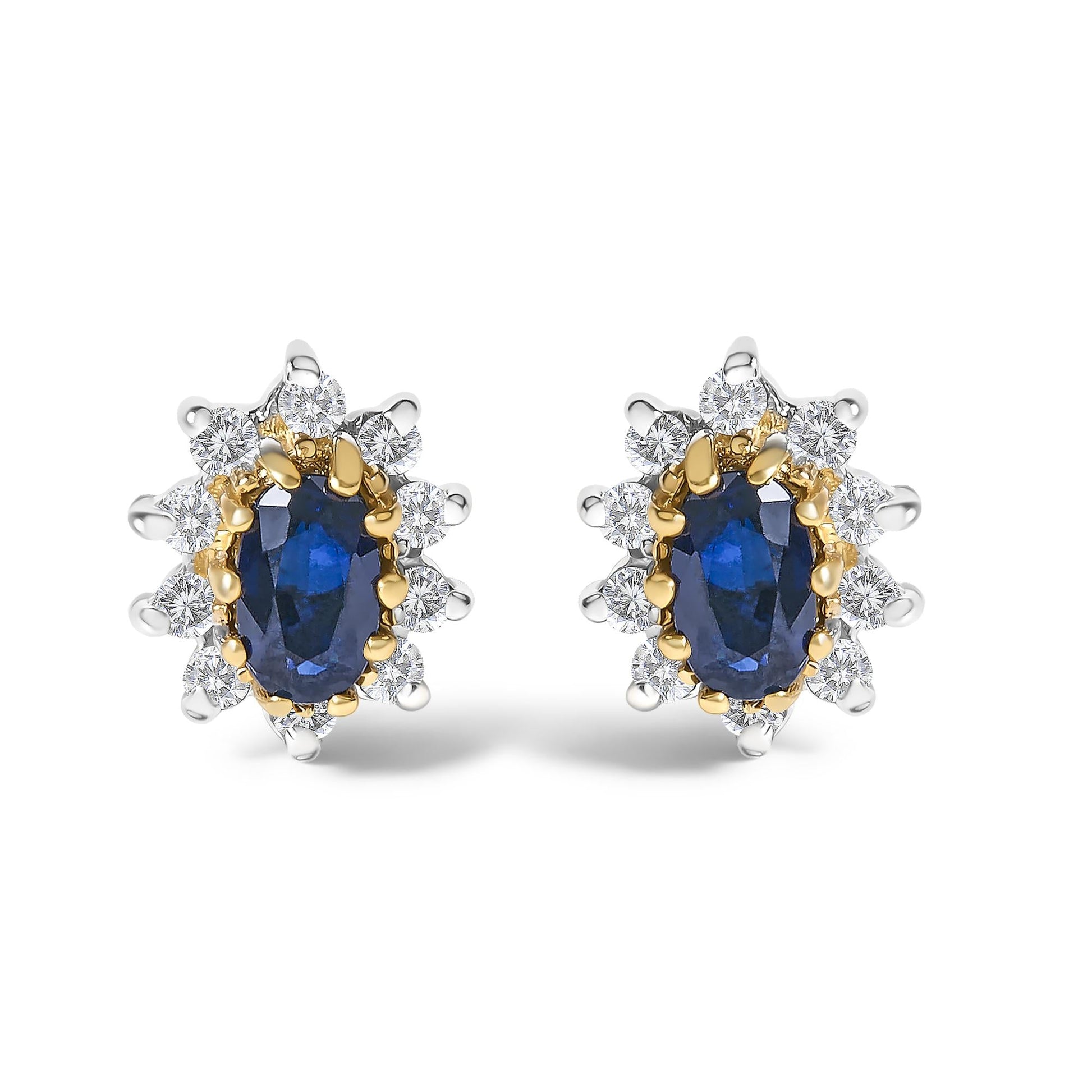 Epitomize elegance and a hint of celestial charm with these exquisite stud earrings, crafted from lustrous 14K yellow gold. At the heart of each piece lies a captivating, oval-cut blue sapphire, measuring 5x3 mm, naturally sourced and enhanced through heat treatment to reveal deep, enchanting hues. Encircling each sapphire, a sunburst halo of natural, round-cut diamonds adds an irresistible sparkle, reminiscent of the morning light scattering across the heavens. The shimmering white metal compliments are thoughtfully rhodium-plated, augmenting the brilliance and making these gems truly stand out. Securely fastened with push back closures, these earrings promise both comfort and unparalleled style, making them a luxurious addition to any outfit, a treasure that speaks of timeless elegance and sophistication.