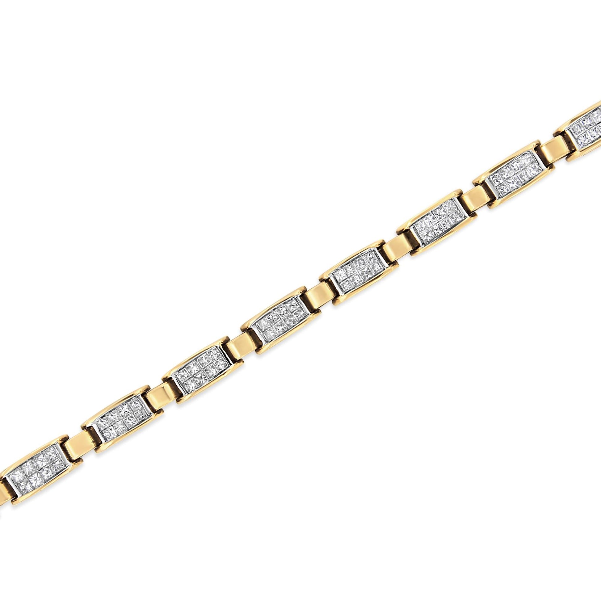This geometric pattern link bracelet is a timeless piece. Small yellow gold bands link with larger bands inlaid with eight princess cut diamonds. 2 1/2ct TDW in diamonds shine in this design. A box with clasp mechanism keeps this 14k yellow gold bracelet design secure. The diamonds sparkle in an invisible setting and will shine bright on your wrist. You will love how this bracelet pairs well with any outfit you put on.