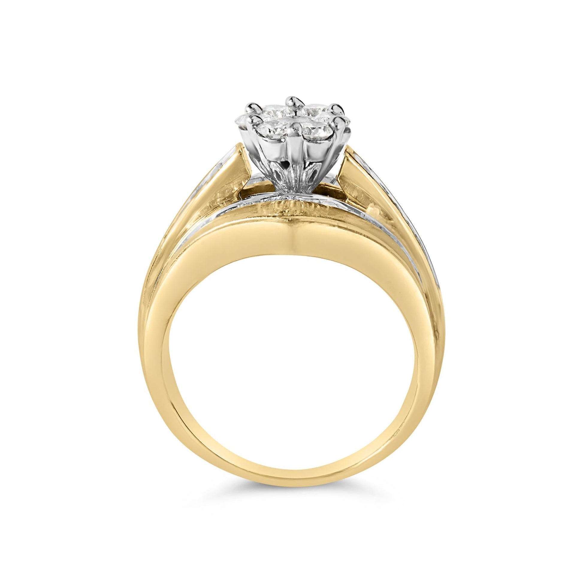 Captivate the essence of everlasting love with this exquisite 14K yellow gold engagement ring, meticulously crafted to shimmer with an opulent cluster of natural diamonds. At the heart, a composite head of round cut diamonds merges seamlessly, mimicking a majestic solitaire that captures the light with every gesture. Encircling this central spectacle, the band unfolds in a harmonious chevron shape, featuring an artful channel setting with three rows of diamonds. The outer rows glimmer with elegantly cut baguettes, while the princess-cut gems at the center row amplify the ring's brilliance. Each diamond, boasting H-I color and SI1-SI2 clarity, orchestrates a symphony of sparkle, making this ring a timeless symbol of your devotion and a perfect testament to a refined taste in jewelry.