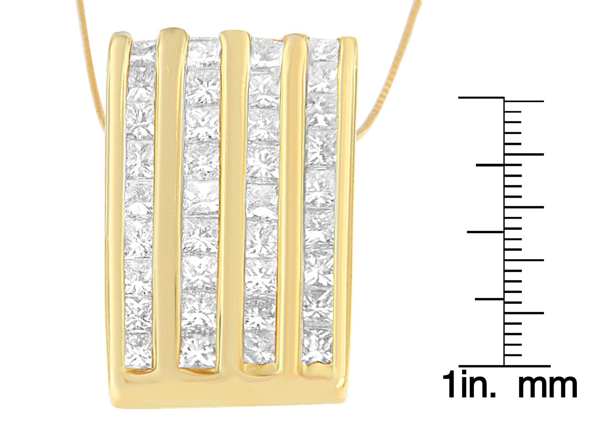 This radiant block pendant is adorned with over two carats of princess cut diamonds for truly brilliant style. Set off by 14 karat yellow gold bands in between, it's a piece that always gets noticed.