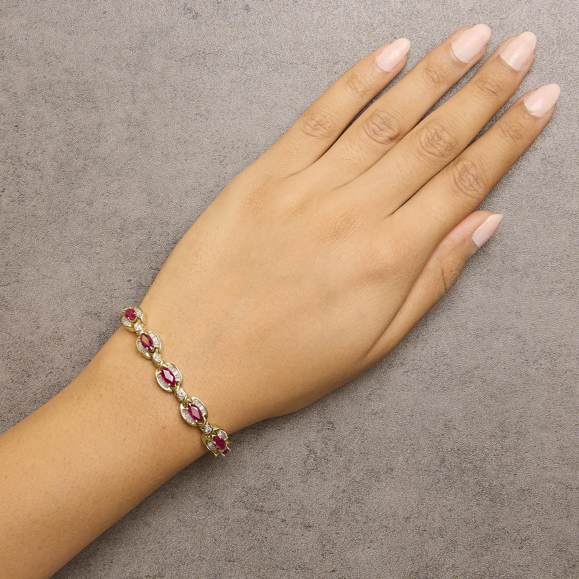 Exquisitely fashioned in 14K yellow gold, this luxurious bracelet captivates with its enchanting vintage design, comprising oval links that gracefully encase a series of natural, heat-treated red rubies, each marquise cut to 8x4 mm and nestled in a four-prong setting that accentuates its vivid hue and brilliance. Flanked by a total of 2.0 carats of dazzling natural diamonds, featuring elegantly channel-set baguettes and mesmerizing bezel-set rounds, this piece glimmers with a rich, opulent allure. Diamonds are G-H color, VS2-SI1 clarity. Its thoughtful craftsmanship ensures a secure fit with a robust box clasp and safety latch, making it a sublime choice for adorning wrists up to 7.25 inches. The vintage-inspired aesthetic and the sophisticated burst of color render it an essential treasure for any elegant evening or significant celebration.