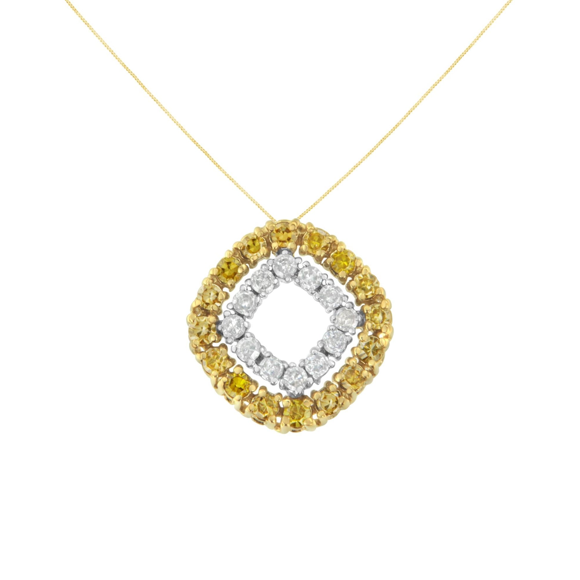 You will love this open, double cushion pendant necklace. Fashioned in 14k yellow gold plated sterling silver this design features 1/2ct TDW of glittering diamonds. A small open cushion shape studded with round cut diamonds sits inside a larger one. The larger shape is studded with yellow color treated round cut diamonds. The color contrast gives this piece a stunning look. The pendant delicately hangs from a rope chain that secures with a spring ring clasp.