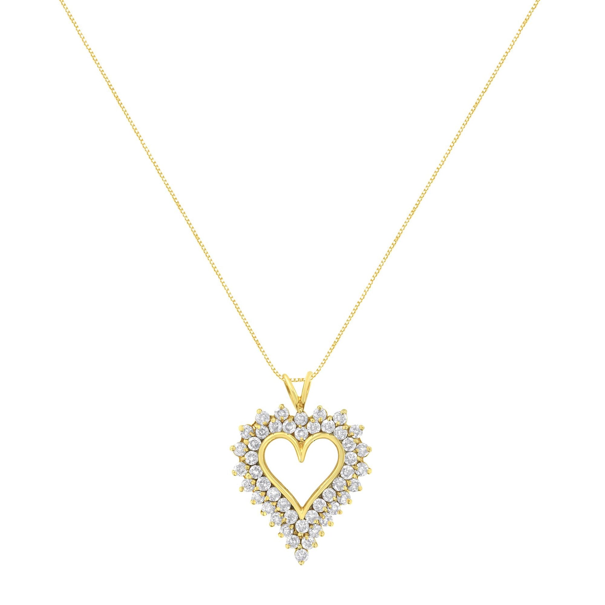 Chic and timeless, this gorgeous heart pendant has an impressive total diamond weight of 4 carats. Natural, sparkling round-cut diamonds dazzle in this 14k yellow gold .925 sterling silver necklace. This is the perfect accessory for a formal night out as this piece will illuminate any outfit you put on. This heart cluster necklace hangs from a gold 18" box chain.