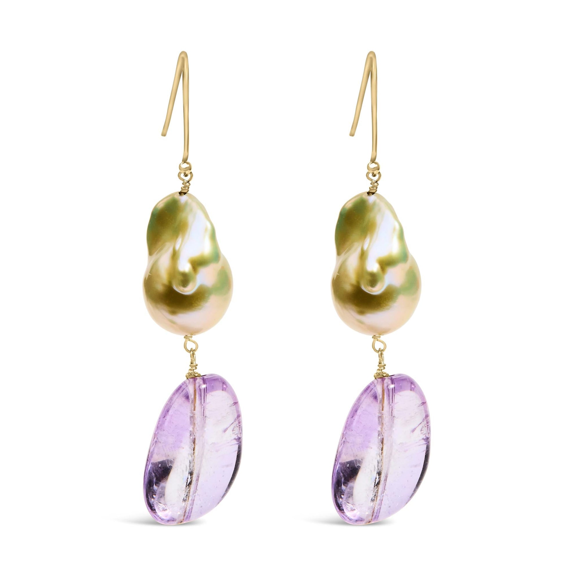 Elevate your ensemble with these exquisite drop and dangle earrings, exquisitely crafted from 14K yellow gold. Each piece stars a naturally sourced, color-enhanced amethyst, whose bold asymmetry and lavender hues enchant the eye, measuring an impressive 20 mm by 15 mm. Suspended elegantly beneath these royal gems are the mesmerizing baroque pearls, renowned for their unpredictable shapes and lustrous sheen, embodying the beauty of uniqueness. Together, they dangle a graceful 2 inches, swaying delicately from French wire hooks, ensuring security with a touch of vintage charm. These earrings promise not only to adorn but also to captivate, making them a perfect tribute to personal style and sophisticated flair.
