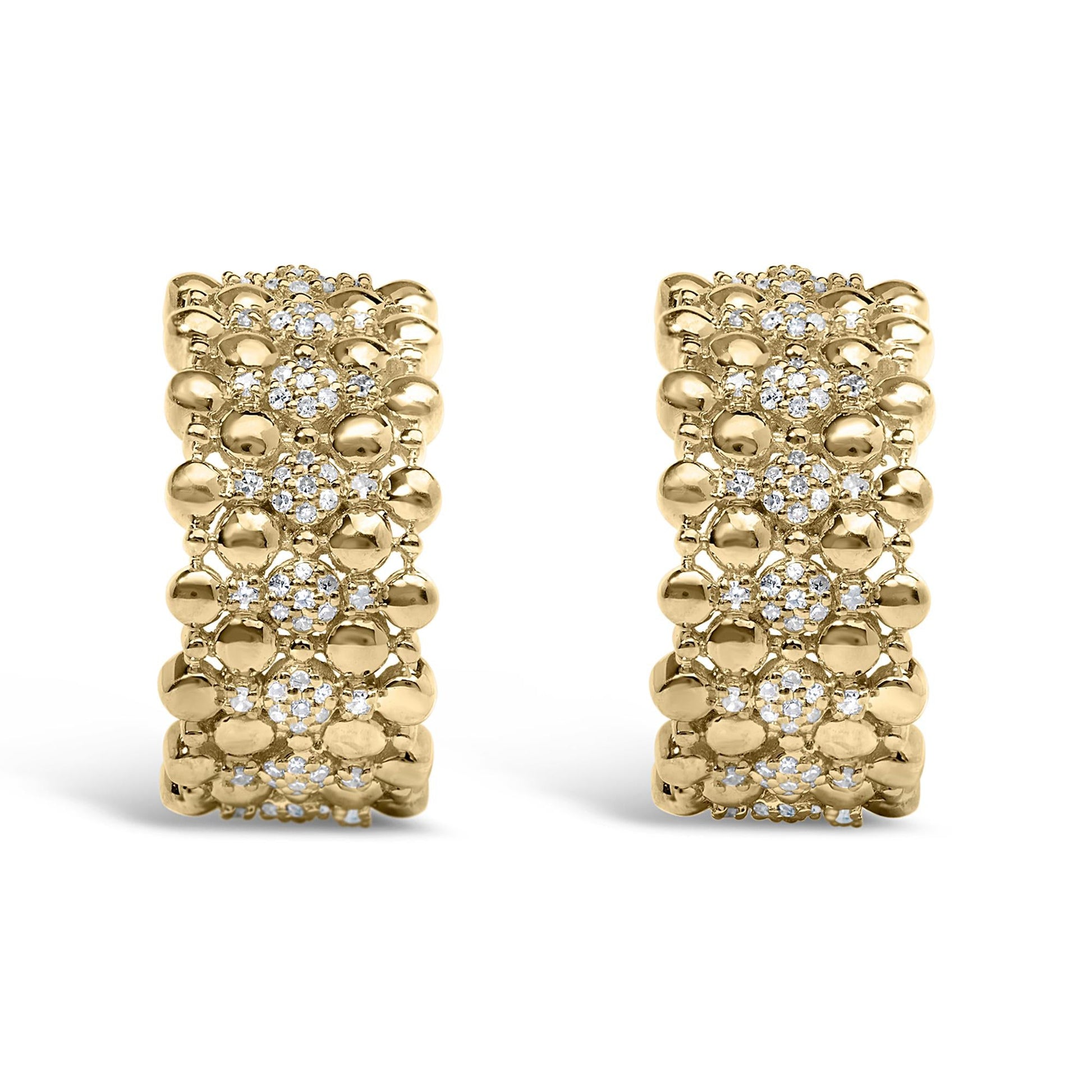 Emanating exquisite elegance, these J Hoop earrings are meticulously crafted from .925 sterling silver with a lustrous flash plating of 14K yellow gold, offering both longevity and a radiant sheen. Each piece seamlessly secures to the ear with a reliable push-back mechanism, designed for comfort and ease. These earrings gracefully drop 3/4 inches from the earlobe and span 8 mm in width, perfect for both day and evening wear. What sets these earrings apart is the harmonious blend of gleaming ball beads and sparkling natural diamonds, sumptuously totaling 1/3 carat. The diamonds, boasting an H-I color and I1-I2 clarity, are arranged in captivating patterns that catch the light with every movement, illuminating your visage and enhancing your natural beauty.