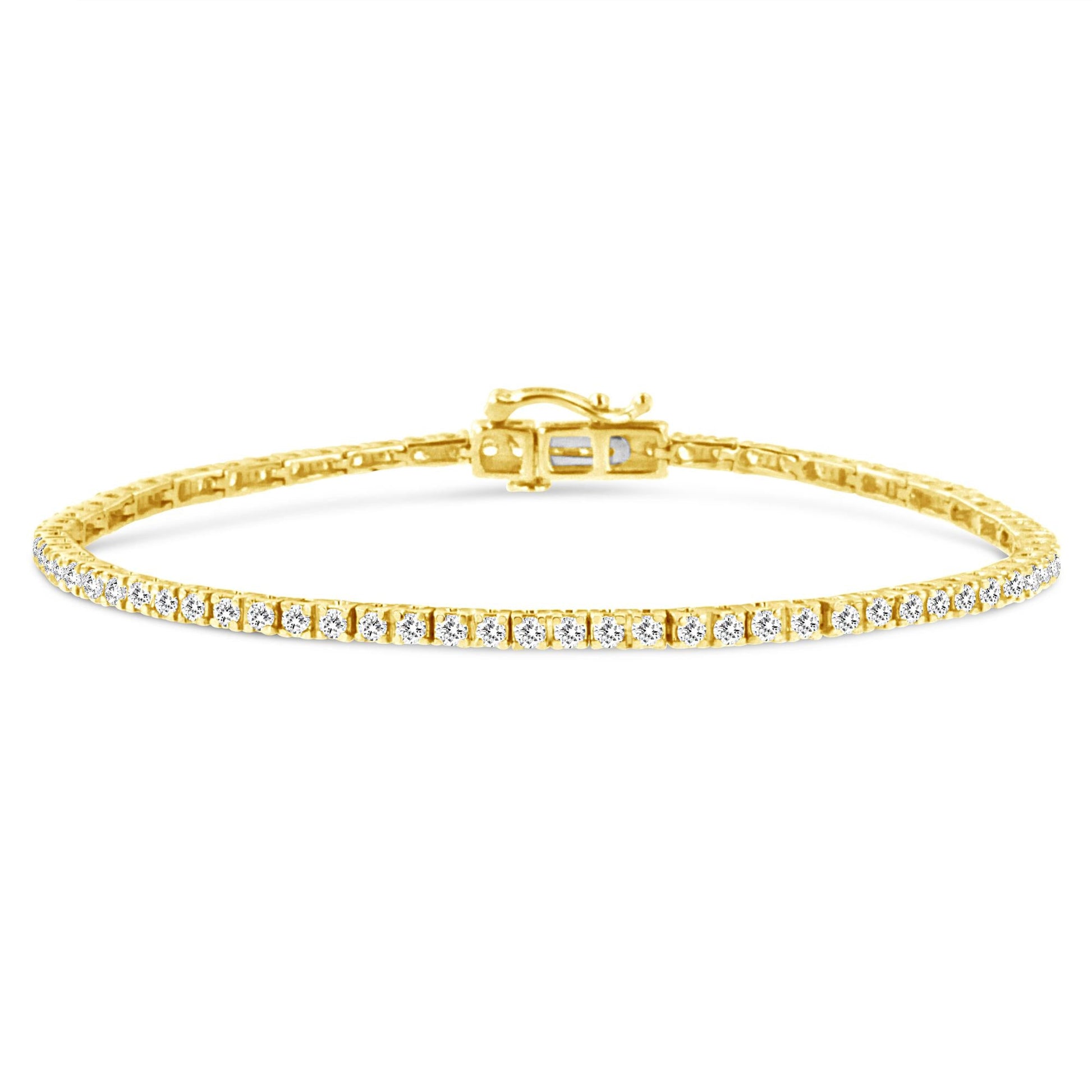 Elegant and timeless, this gorgeous 14 karat yellow gold plated 92.5% sterling silver tennis bracelet features 2.0 carat total weight of natural round brilliant cut white diamonds with a whopping 78 individual stones in all. The tennis bracelet has hinged links consisting of two prong set diamonds each. The 7.25” long bracelet culminates in a secure box with tongue and safety clasp. Whether worn for daytime glamour or evening sparkle, this classic tennis bracelet is gorgeously versatile. It’s a timeless treasure she’ll enjoy wearing every day. This classic tennis bracelet makes a great gift for any special occasion, as well as a great gift for those with April birthdays! Diamonds are thought to give the wearer clarity and illuminate solutions to life’s problems, as well as encouraging abundance, strength, courage, harmony, faithfulness, and commitment. Give her a gift that will perfectly complement her favorite ensemble.