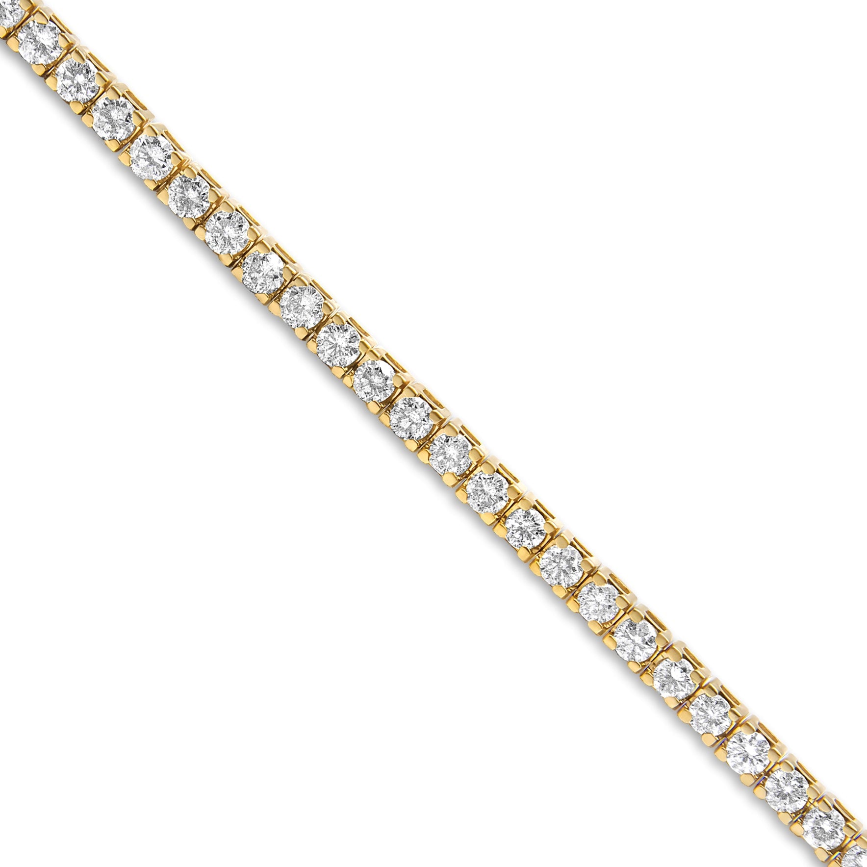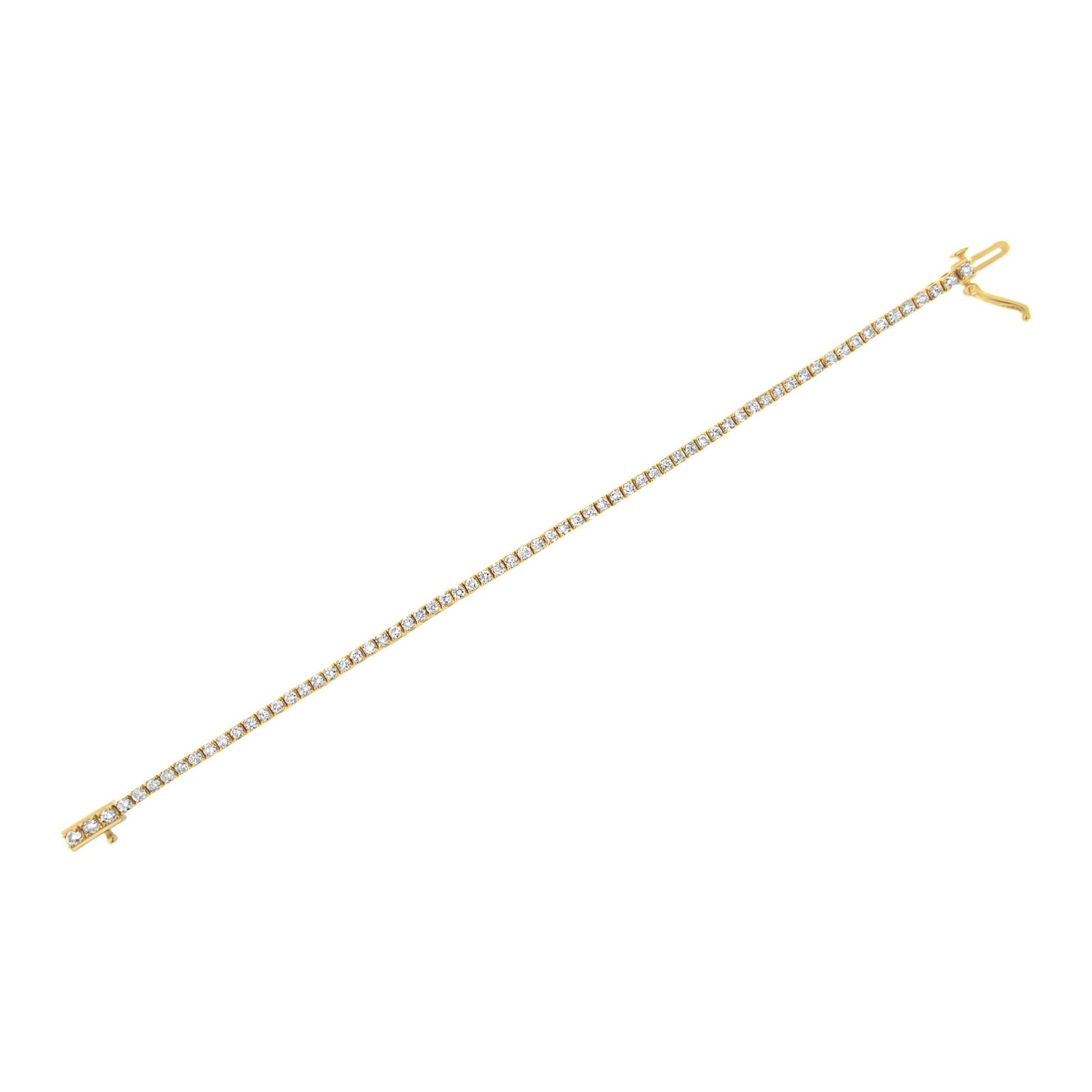 This tennis bracelet has a classic and timeless design. Fashioned in 14k yellow gold plated .925 sterling silver, this design features 3ct TDW of glimmering round cut diamonds. 68 prong set diamonds make up this piece that secures with a box with clasp mechanism.