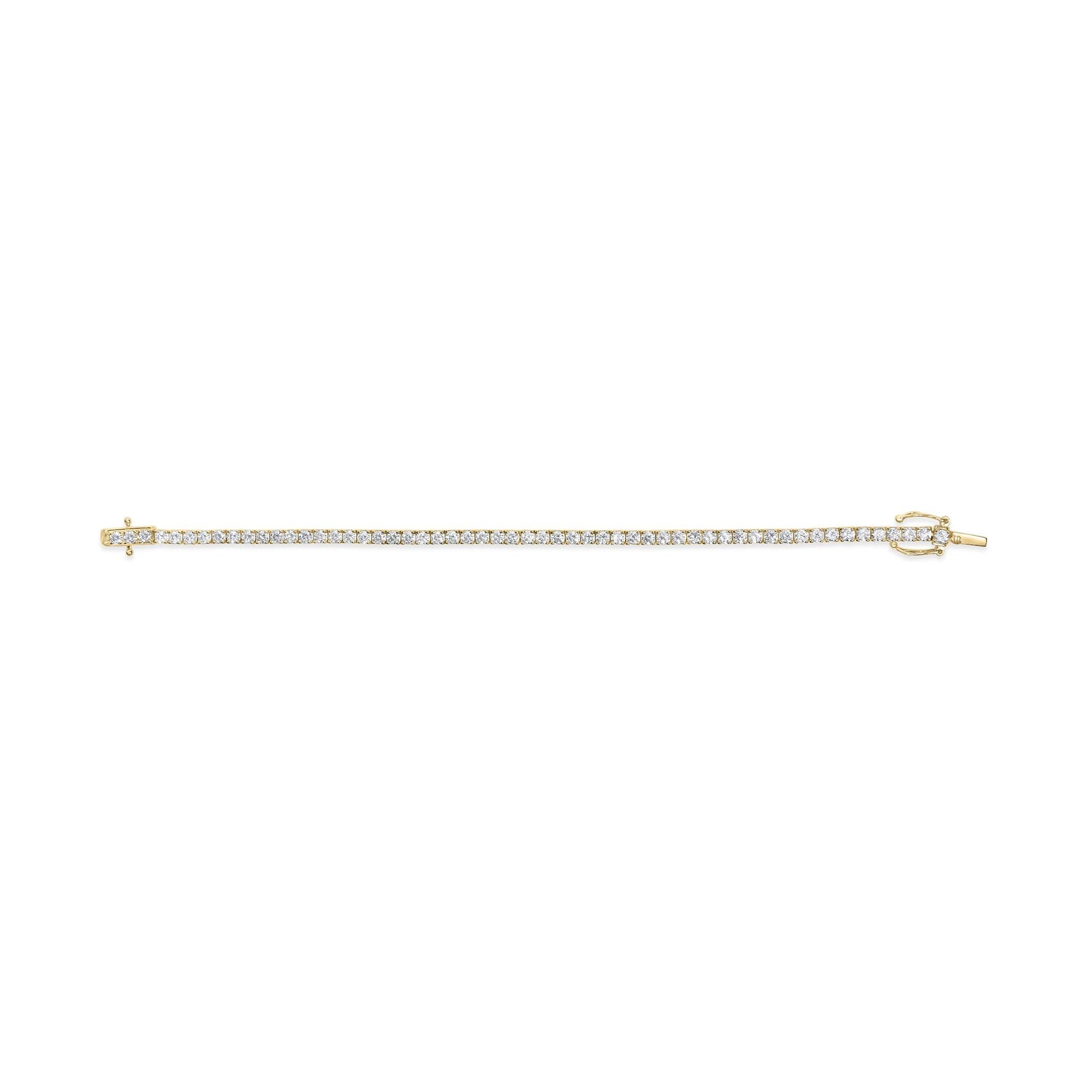 Unveil timeless elegance with this exquisite tennis bracelet, a symphony of precision and style. Crafted from .925 sterling silver and bathed in a sumptuous 14K yellow gold plating, this 7.25-inch masterpiece is adorned with a breathtaking array of brilliant round-cut, lab-grown diamonds, totaling an impressive 5.00 carats. Each gem, with clarities from VS2-SI1 and hues ranging from F-G, is meticulously held by a four-prong setting, designed to capture and reflect every flicker of light, ensuring a dazzling display of fiery brilliance. This bracelet is engineered not only for its aesthetic splendor but also for comfort and durability, guaranteeing a secure fit with its box clasp.