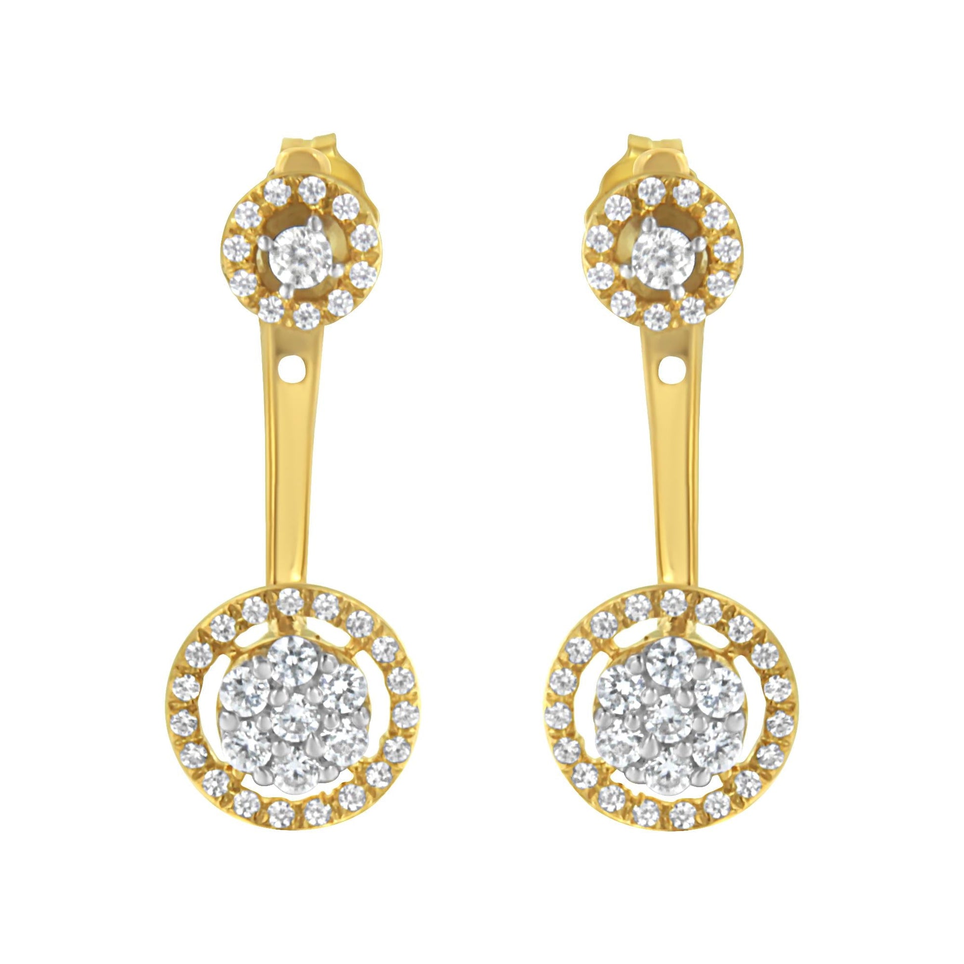 Delight in the timeless elegance of our 14K yellow gold-plated sterling silver earrings. Embellished with a stunning array of round-cut diamonds totaling 5/8 carat, these earrings radiate a captivating sparkle. Versatility is at the heart of this design, featuring detachable studs. Each stud showcases a central round-cut diamond, encased by a halo of accent diamonds. The flower-inspired design of the studs, with a diamond cluster nestled within a floating halo of accents, adds an extra layer of allure. With a graceful drop of 4/5 inch, these pieces add a dash of sophistication to any look. They can be worn with or without the jackets, suiting both casual and formal styles. As a testament to fine craftsmanship and elegance, these earrings are a worthy addition to any collection. For a subtler effect, the top stud can be worn solo.