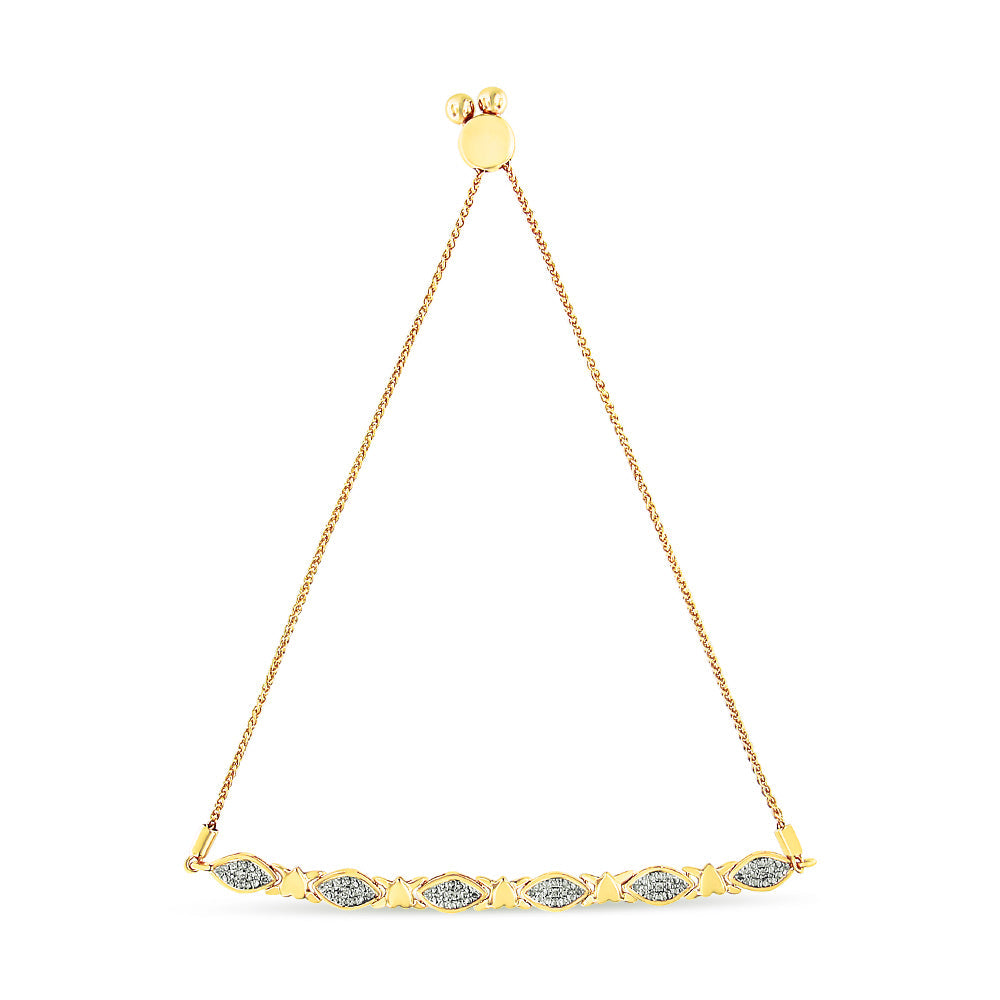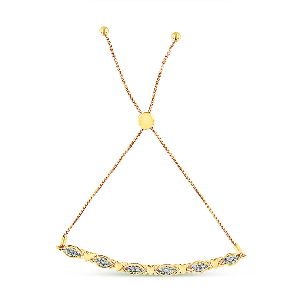 Equal parts sweet and elegant, the bracelet comprises an array of details that make it extra special. The 14K yellow gold plated .925 Sterling Silver bolo chain is linked to six marquise shaped charms that are pavéd with natural round diamonds, totaling up to 1/10 cttw. Five cute heart-shaped accents are also added to the mix. It’s complete with a secure slider that can be adjusted for a custom fit from 6 to 9 inches