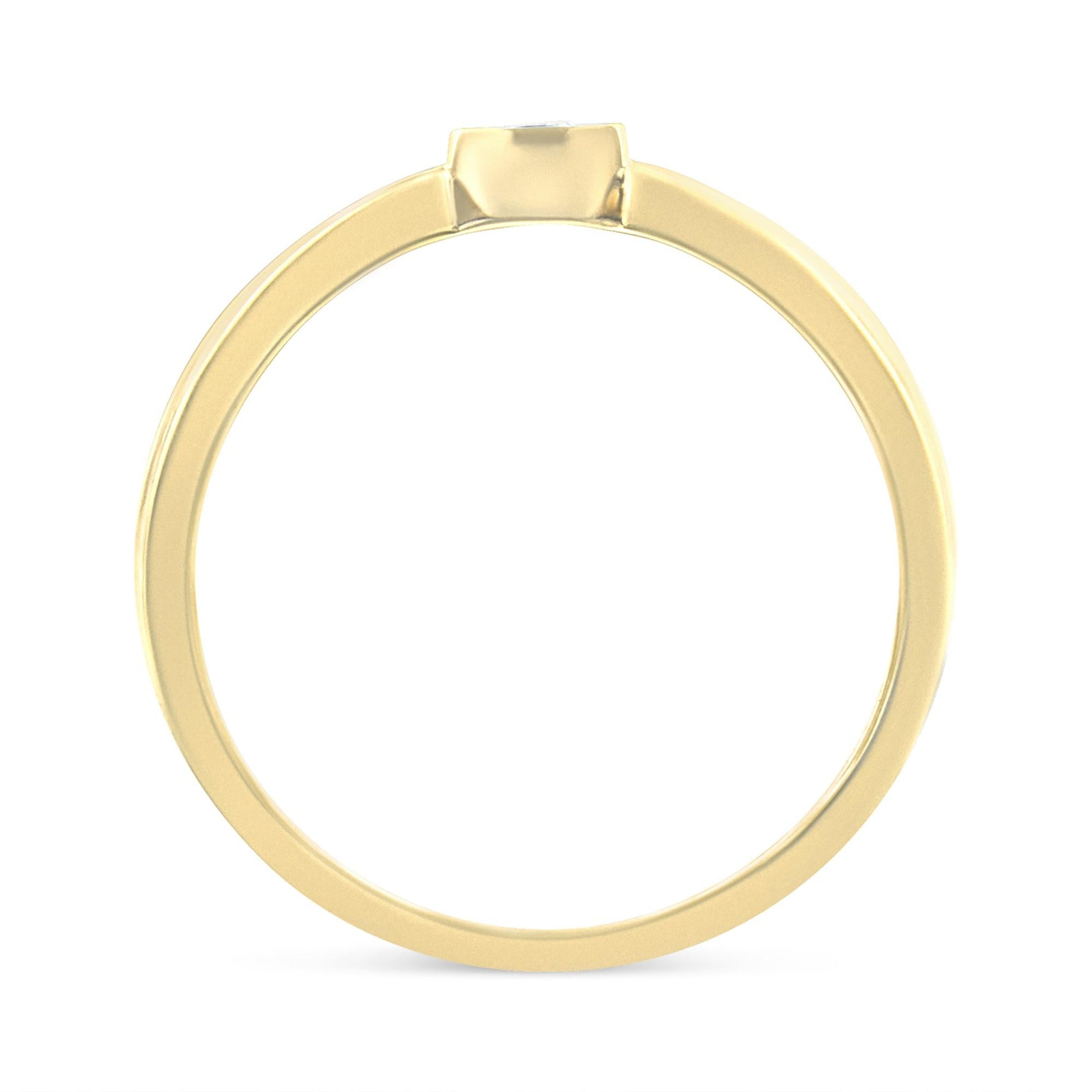 A classic look for the classic girl. Fashioned in stunning 14k yellow gold plated sterling silver, this promise ring features a shimmering 1/20 cttw round-cut diamond solitaire in a unique miracle plate setting for maximum sparkle. This piece is crafted in the finest .925 sterling silver, and is plated with rhodium (a platinum-family metal) for a lifetime of tarnish-free wear. The diamond is set in a oval shaped setting for a unique twist on the traditional promise ring design. This ring is the most elegant way to promise yourself to her. Show your commitment with this diamond promise ring.