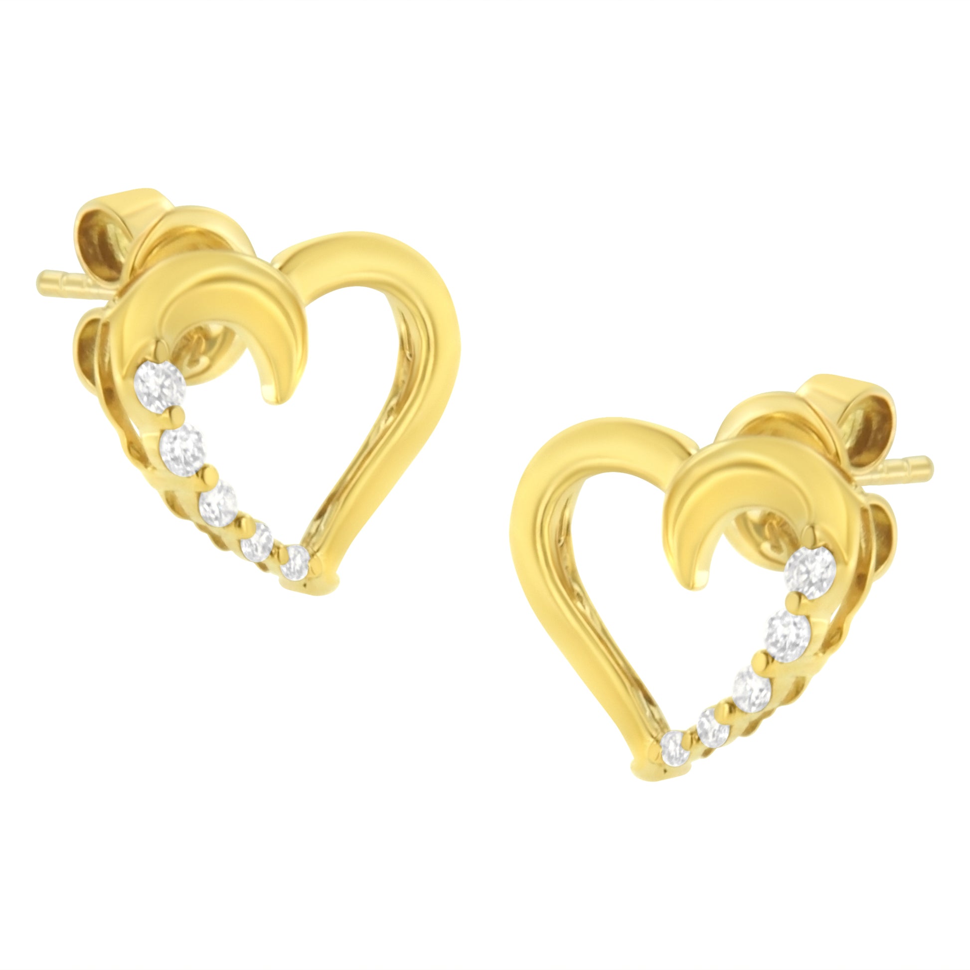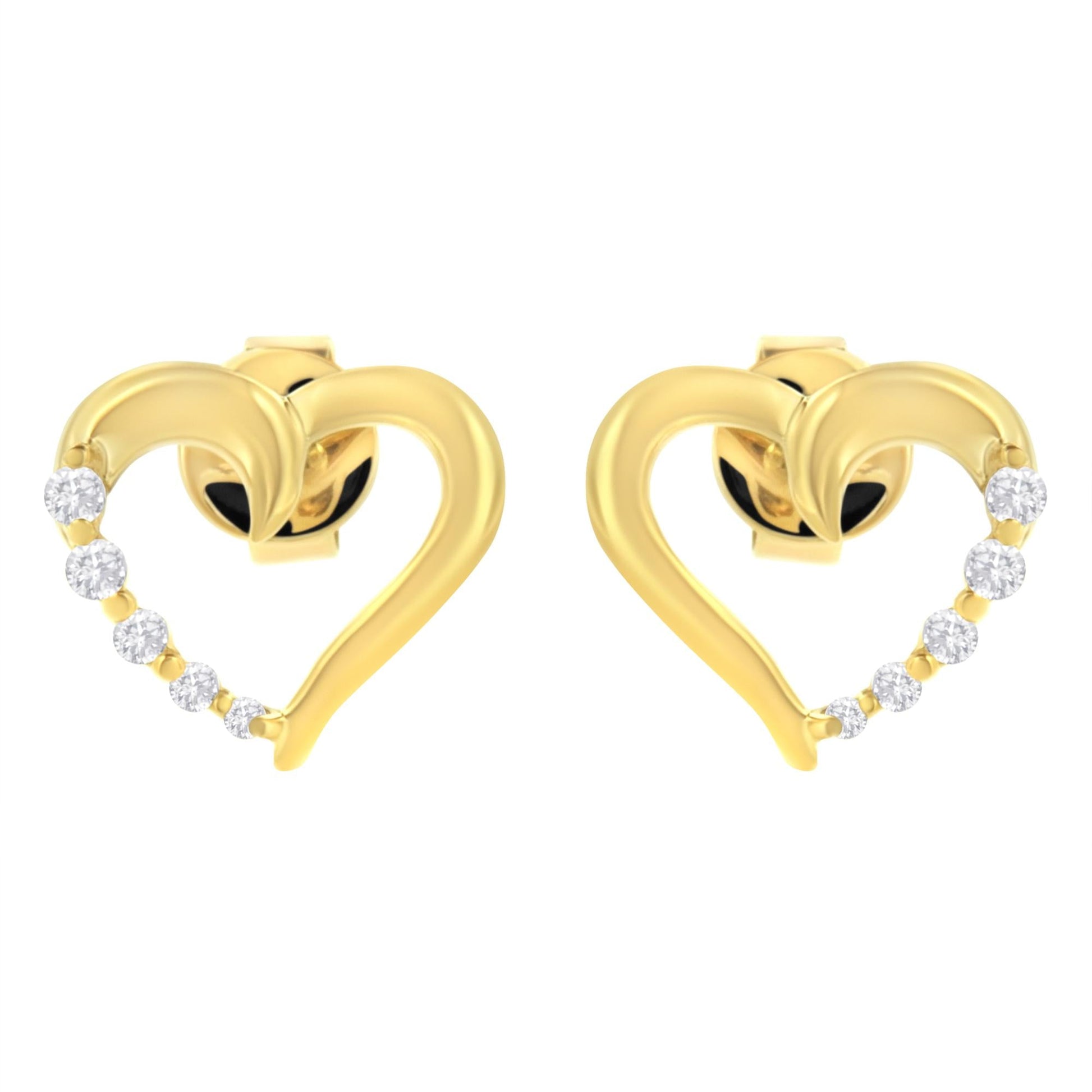Admire your beloved with the touch of this fascinating Diamond Journey Earrings that will surely captivate her. Stunning pair of heart shaped earrings showcases 10 dazzling round cut diamonds representing your growing love. Diamonds are beautifully prong set in luminous 14 karat yellow gold. Total diamond weighs 1/8 ctw.