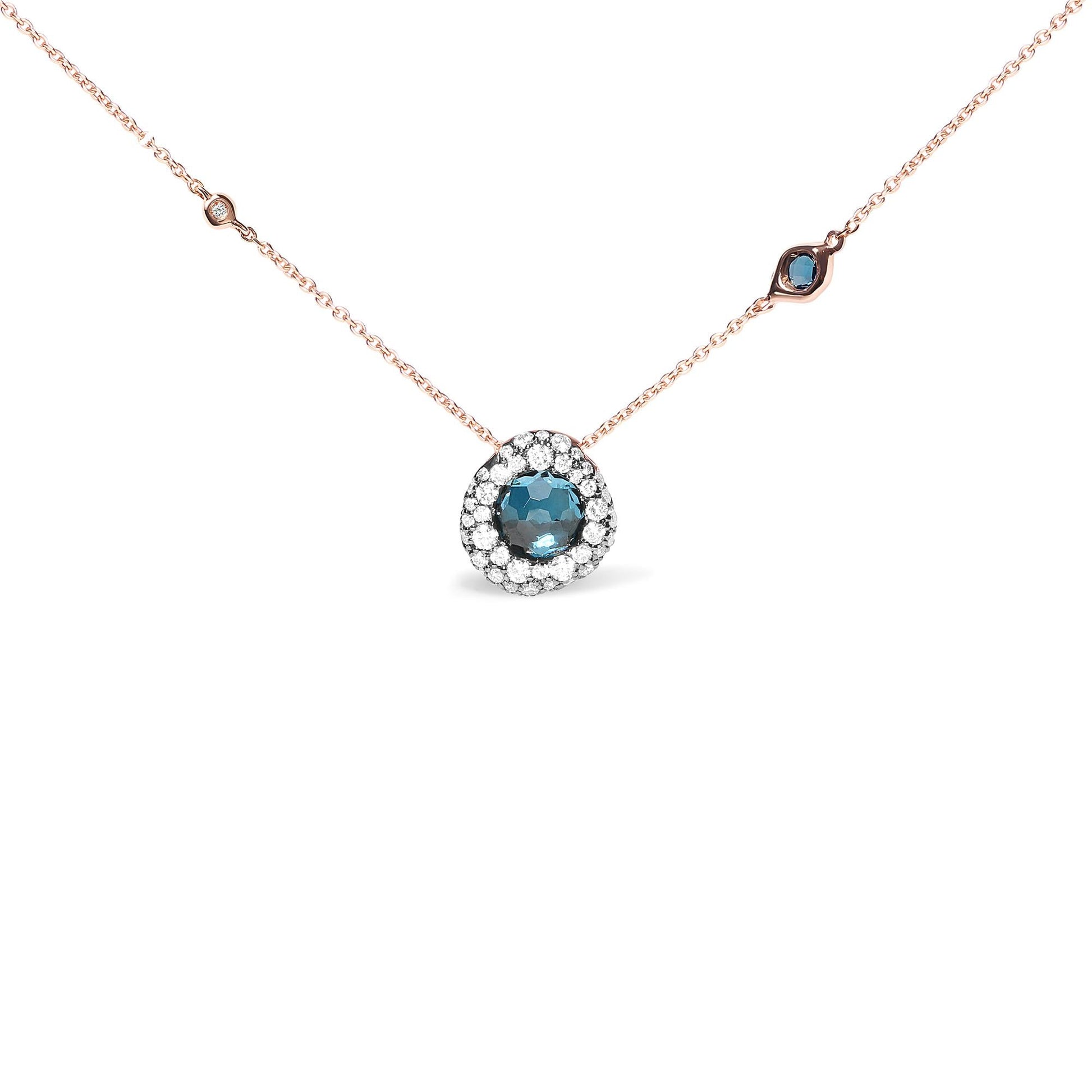 This exceptional 18k rose gold station necklace features a natural 7.7mm round bezel-set topaz in a vivid heat-treated London blue hue that serves as an eye-catching centerpiece. A cluster of round, bezel-set diamonds encircles this crisply colored gemstone, adding their own sparkle in a total 5/8 cttw with an approximate G-H Color and SI1-SI2 Clarity. Stationed along the chain, a 3x3mm round bezel-set blue topaz winks its sparkle as a solo accompanist to this stunning piece. The contemporary yet classic 18" cable chain complements any neckline beautifully and secures with a lobster claw clasp.