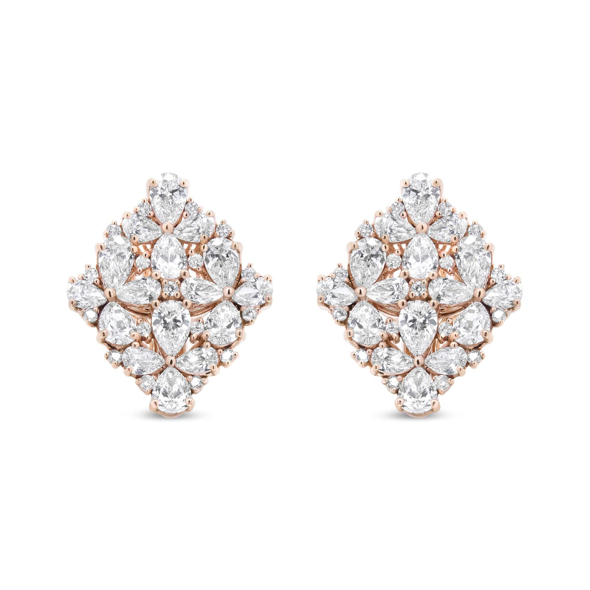 These bold earrings dazzle with a wow-factor like none other! A shimmering collection of diamonds sparkle from all over the face of these marquise-shaped earrings. Glittering pear-shaped diamonds act as the petals in this floral motif, each set in pretty prong settings. Additional round white diamonds accent these main stones, each in prong settings. Crafted of 18k rose gold, these statement earrings will have everyone doing a double-take at your ears. The diamonds total 8 1/3 cttw with an approximate F-G Color and VS1-VS2 Clarity. Omega clip on findings keep these pierced earrings safe and secure on your ears for comfortable wear all day long.