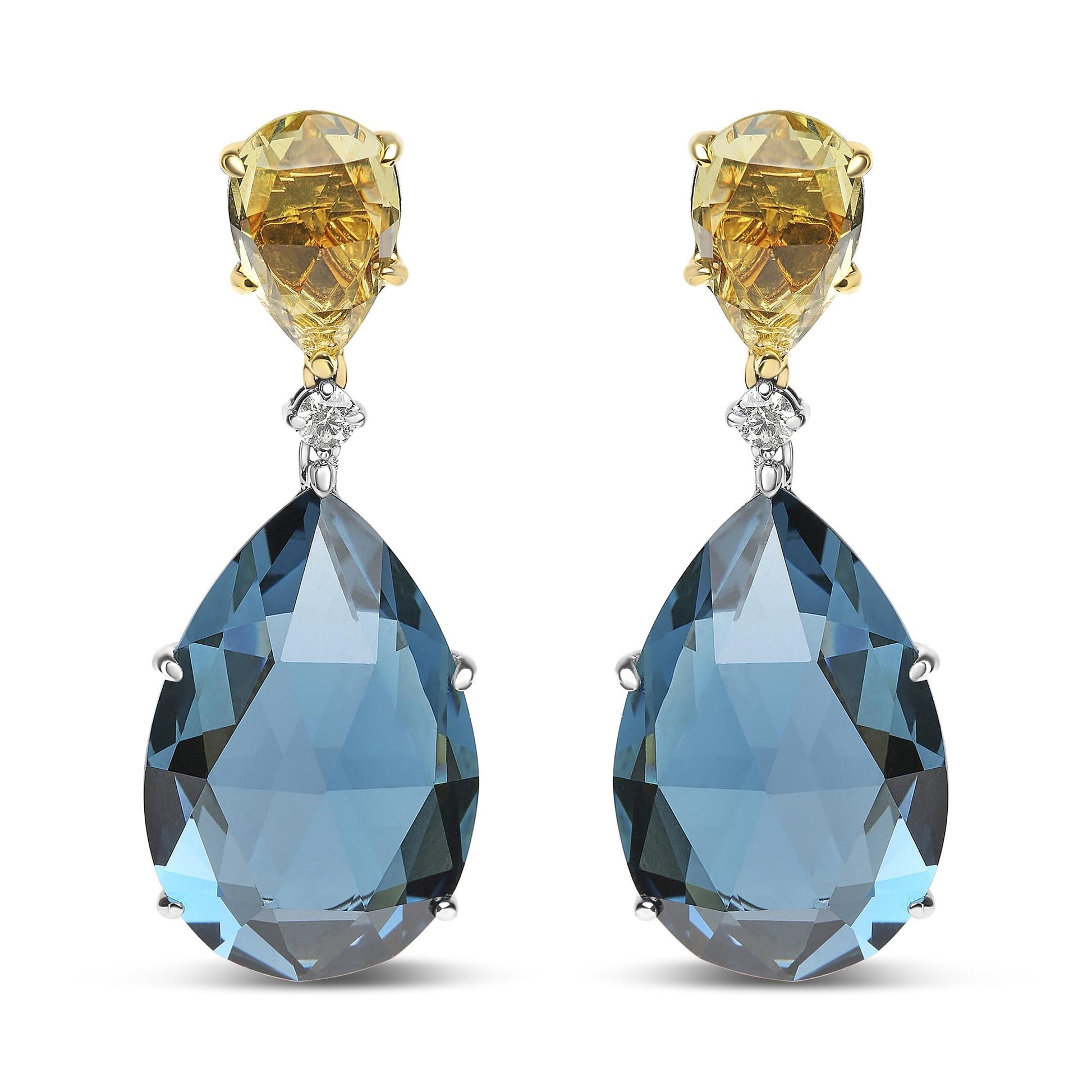 Make an unforgettable entrance wearing these grand sparkling dangle earrings crafted of genuine 18k white and yellow gold. Pull your hair back and show off the natural gemstones and diamonds that adorn these luxury earrings in glittering splendor. The upper dangle is prong-set with a 12x10mm pear-cut heat-treated lemon quartz and the lower shimmers with a 25x18mm pear-cut heat-treated London blue topaz also in a prong setting. Center to these two gems is a radiant round diamond in a prong settings. The diamonds in this pair total 1/5 cttw with an approximate G-H Color and SI1-SI2 Clarity. Push back findings secure these pierced earrings comfortably in the ear.