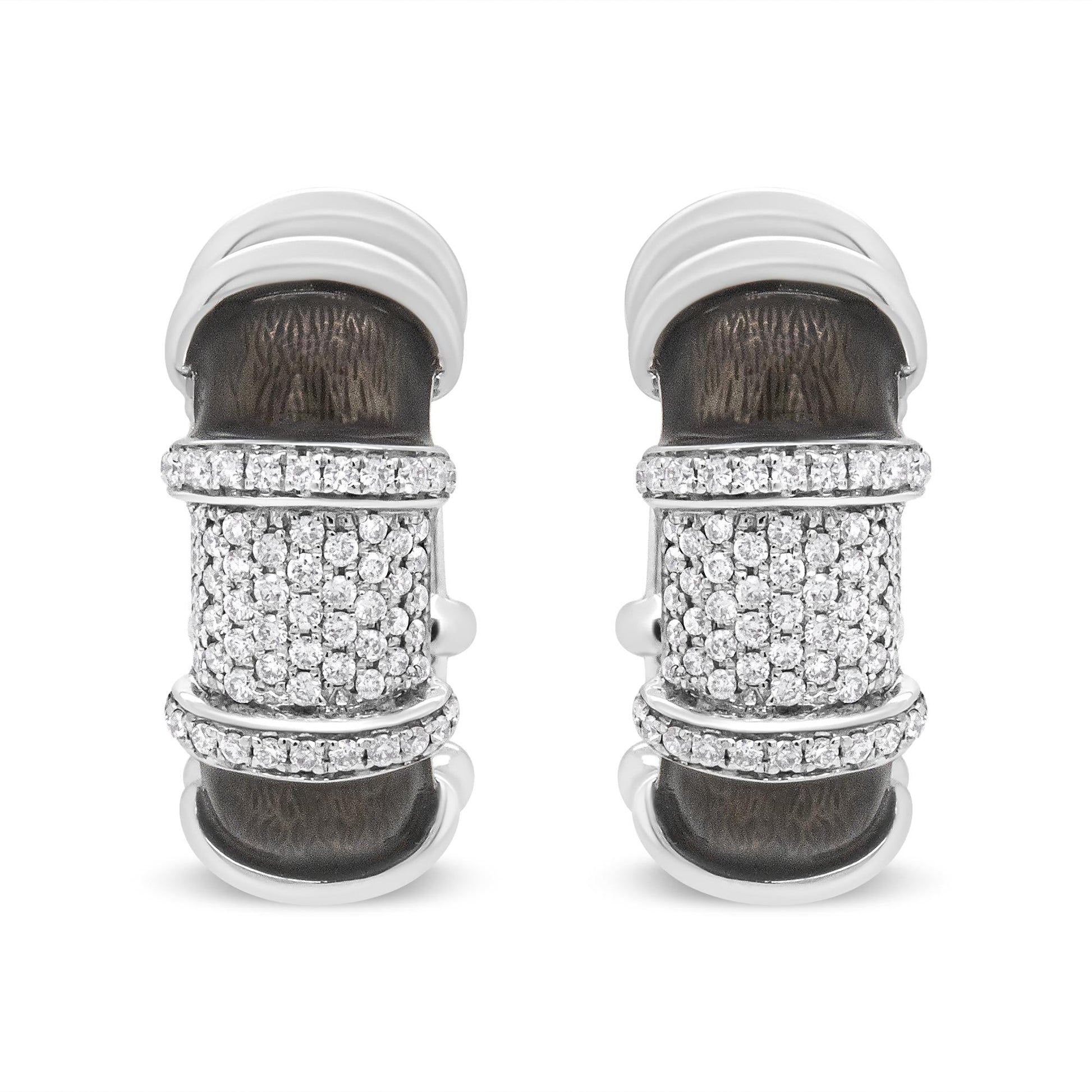 These eye-catching clear graphite grey enamel earrings are made from 18k white gold flash plated .925 sterling silver with sparkling prong-set round diamonds that adds a touch of sparkle to whatever you are wearing. A unique motif of metalwork brings a distinctive flair to these huggie hoops, allowing the rich colors to show through in all their brilliance. At the center, rows of diamonds flash, shimmer, and shine their captivating beauty in a total 5/8 cttw with an approximate F-G Color and VS1-VS2 Clarity. Latch findings keep these pierced earrings safe and secure on the ears for comfortable, worry-free all day wear.