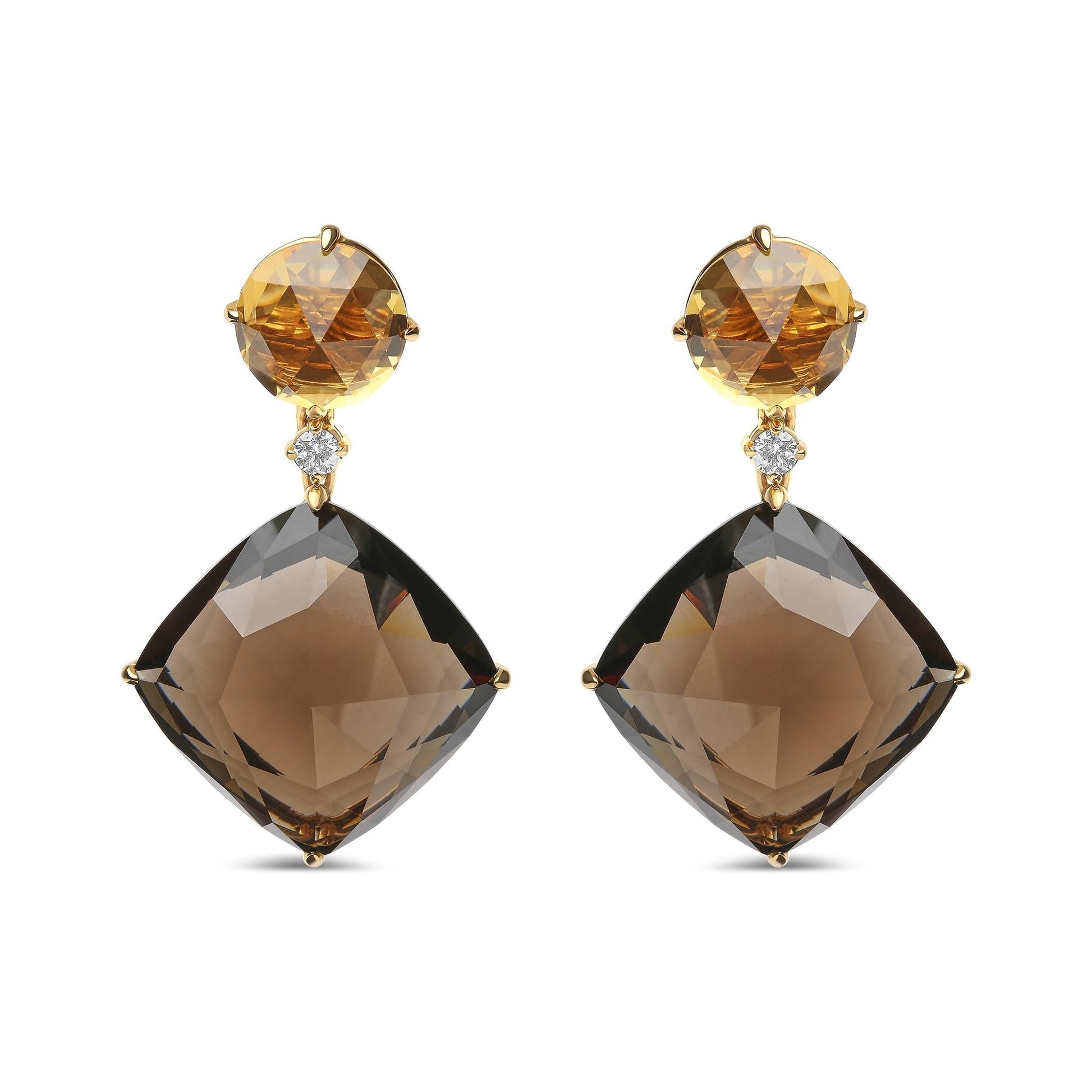 These statement 18k yellow gold dangle earrings are ready to elevate your wardrobe with their sparkling wealth! Mounted in 4-prong settings, natural 10x10mm round heat-treated yellow citrine gemstones shine brilliantly in a checkerboard cut in each earring. Singular round white diamonds shine on in prong settings directly below the citrines. The 25mm cushion-cut heat-treated smoky quartz gemstones complete a ravishing look and attract attention with their distinctive beauty. The diamonds total 1/5 cttw with an approximate G-H Color and SI1-SI2 Clarity. Push back findings secure these pierced earrings comfortably in the ear.