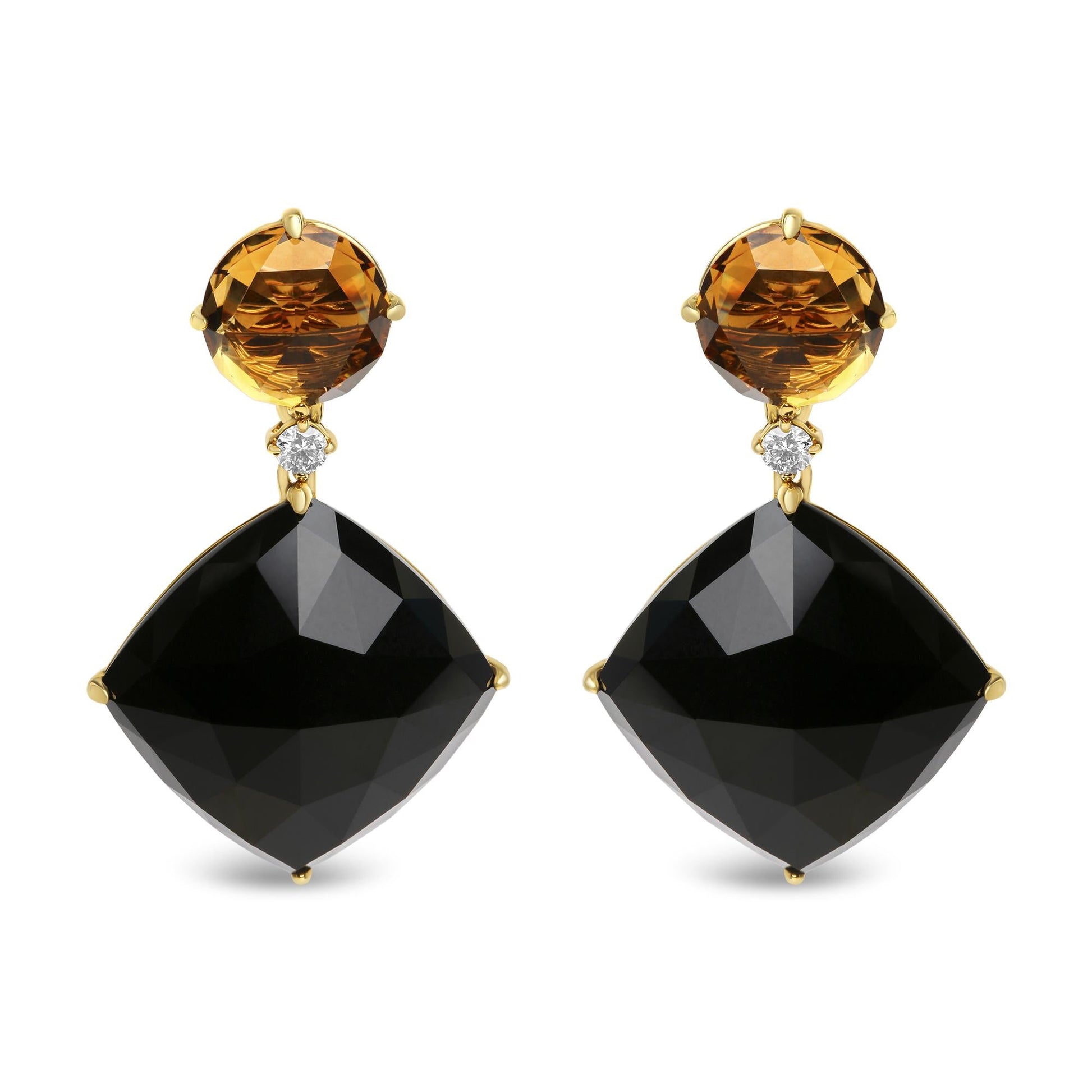 Sophisticated and alluring, these 18k yellow gold dangle earrings are ready for a night out on the town! A natural 10x10mm round heat-treated yellow citrine gemstone in a prong setting sits neatly on the upper dangle, followed by a round, prong-set diamond. The lower dangle is comprised of a 25mm cushion-cut heat-treated black onyx gemstone in a 4-prong setting. The diamonds in this pair total 1/5 cttw with an approximate G-H Color and SI1-SI2 Clarity. Push back findings keep these pierced earrings secure on your ears for comfortable wear all day.