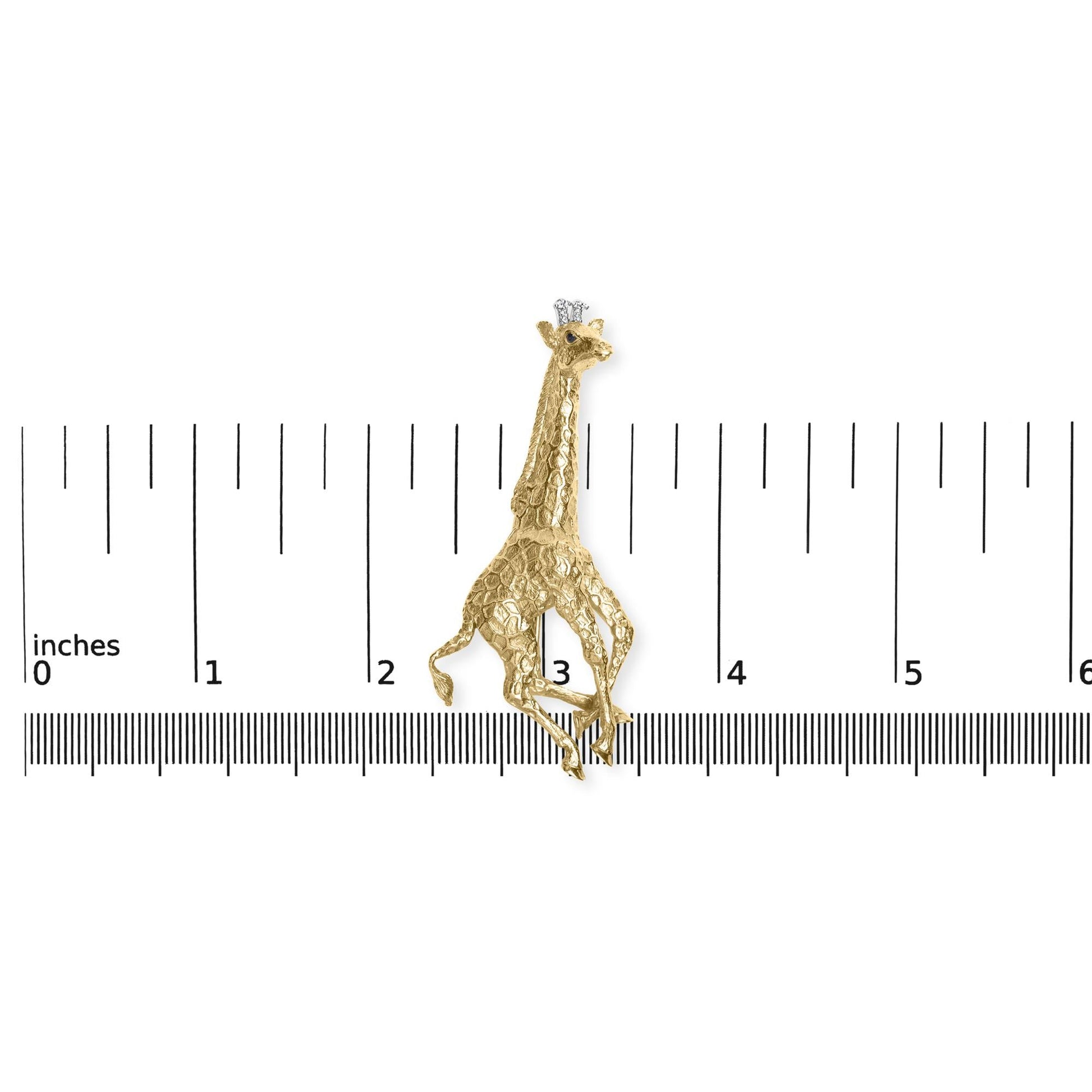 Elegance meets whimsical luxury with this exquisite 18 Karat Yellow Hold giraffe brooch, a testament to meticulous artistry and a celebration of nature’s grace. The giraffe, rendered in a textured finish that artfully mimics its natural pattern, is brought to life with articulated legs that capture every delicate movement. A crown of natural diamonds (G-H color, VS2-SI1 clarity) embellishes its head, lending a regal touch to this unique creation. The enchanting gaze of the giraffe is highlighted by vivid blue sapphires natural yet expertly color-treated to enhance their mesmerizing depth and allure. This brooch radiates sophistication and charm, designed to blend the whimsy of animal motifs with the grandeur of fine jewelry.