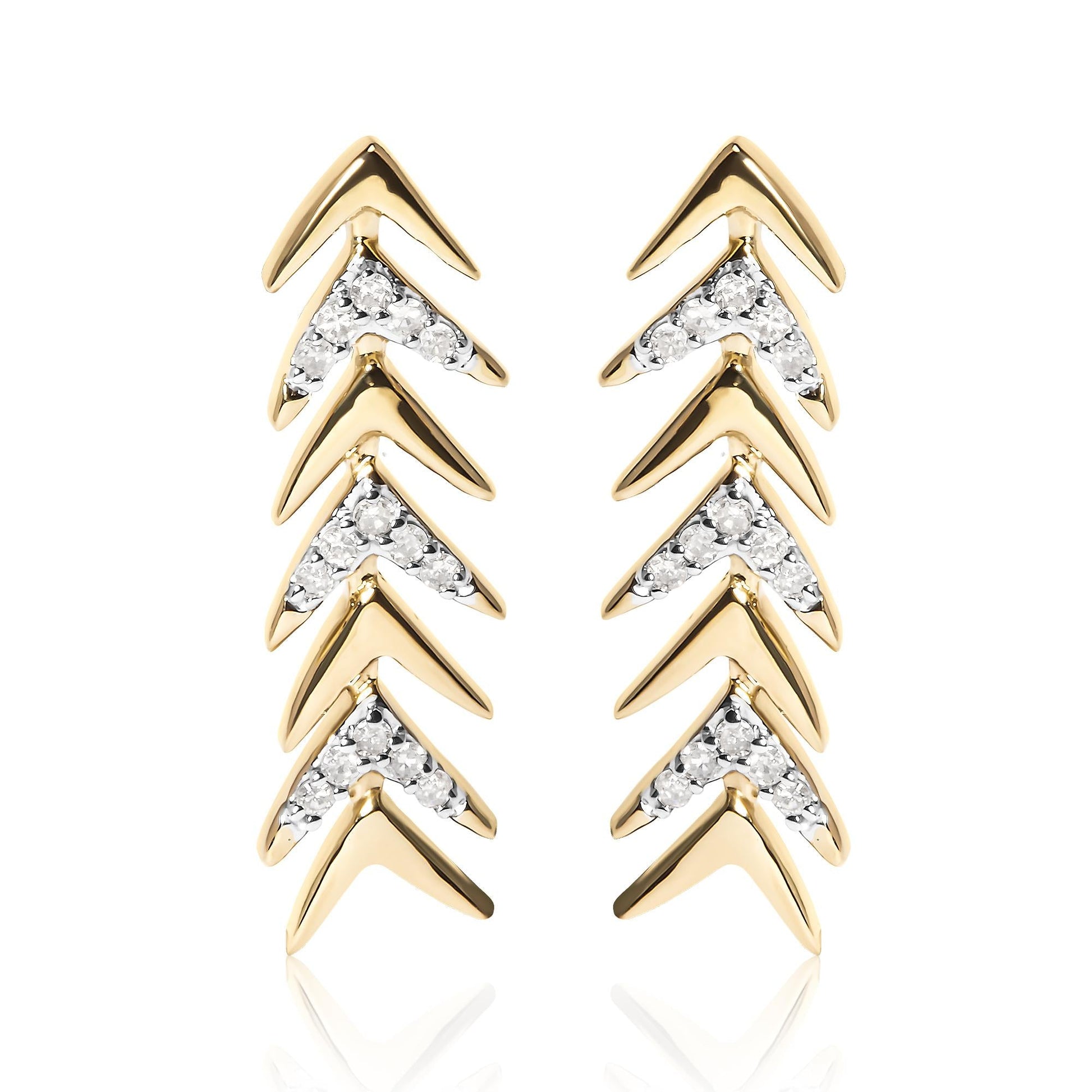 Let elegance take flight with these enchantingly crafted stud earrings, designed to mirror the precision of a chevron arrow. The harmonious alignment of arrowhead contours, each meticulously set with radiant natural diamonds totaling 1/5 carat, adds a layered depth of sophistication. Fashioned in .925 sterling silver and lavishly plated in 18K yellow gold, these studs blend enduring strength with opulent aesthetics. The diamonds, with an I-J color and I2-I3 clarity, glisten with a discreet luster that catches the light, promising a subtle yet compelling sparkle. Each piece secures comfortably with a classic post and butterfly back, ensuring they grace your lobes with their presence consistently. Perfect for both daytime charm and evening glamour, these earrings promise to be an indispensable addition to your jewelry collection, enhancing every ensemble with a touch of refined splendor.