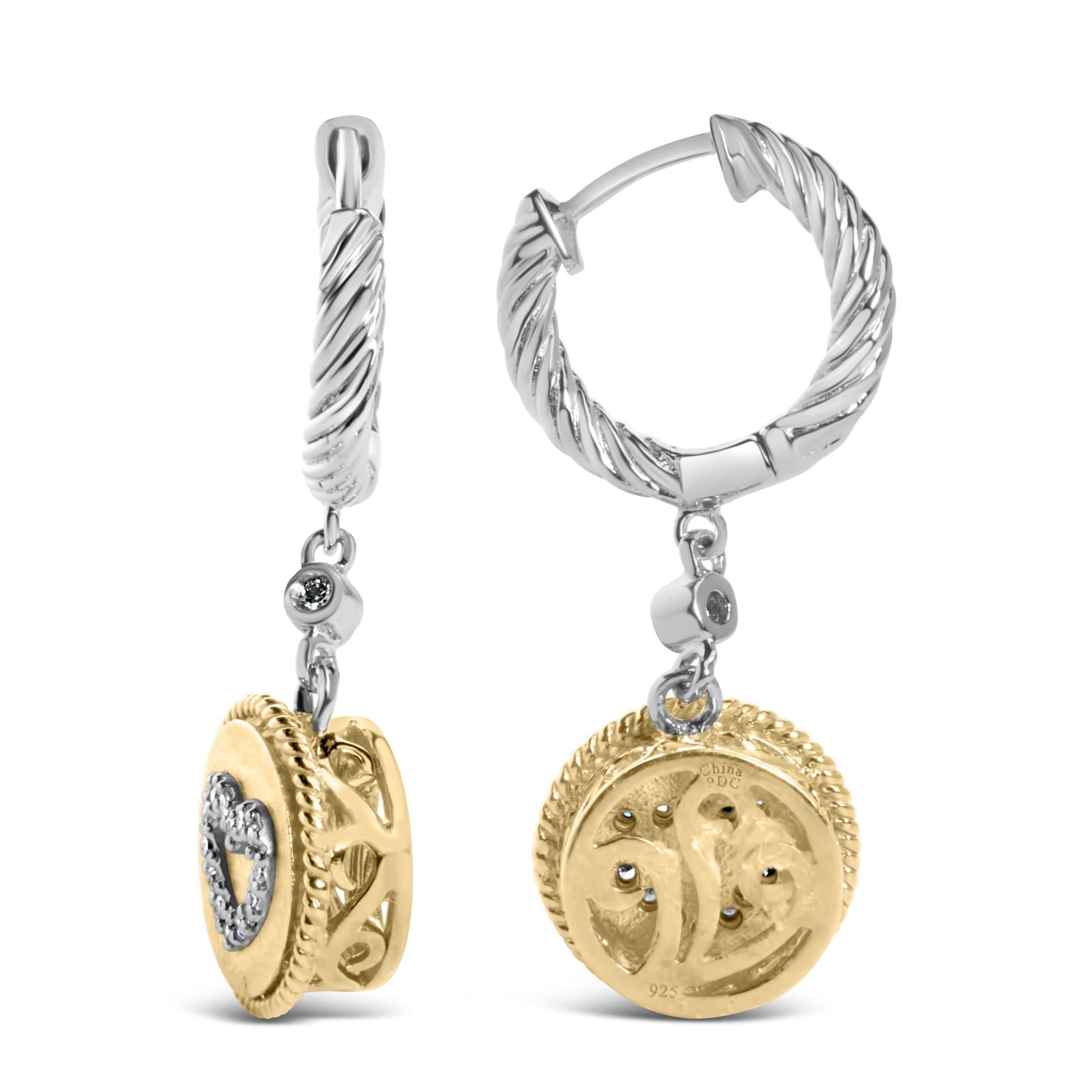 Indulge in elegance and sophistication with our 18K Yellow Gold Plated .925 Sterling Silver Diamond Heart Medallion Drop and Dangle Earrings. Each earring features a captivating natural diamond with a total weight of 1/8 carats, showcasing a beautiful I-J color and sparkling SI1-SI2 clarity. The 30 round diamonds are delicately set in shared prongs, creating a stunning display of brilliance and glamour. These dangle earrings are designed to exude charm and grace, making them a perfect accessory for any occasion. The snap post closure ensures a secure fit, allowing you to wear them with confidence all day long. Elevate your style with these exquisite earrings that blend timeless beauty with modern sophistication.