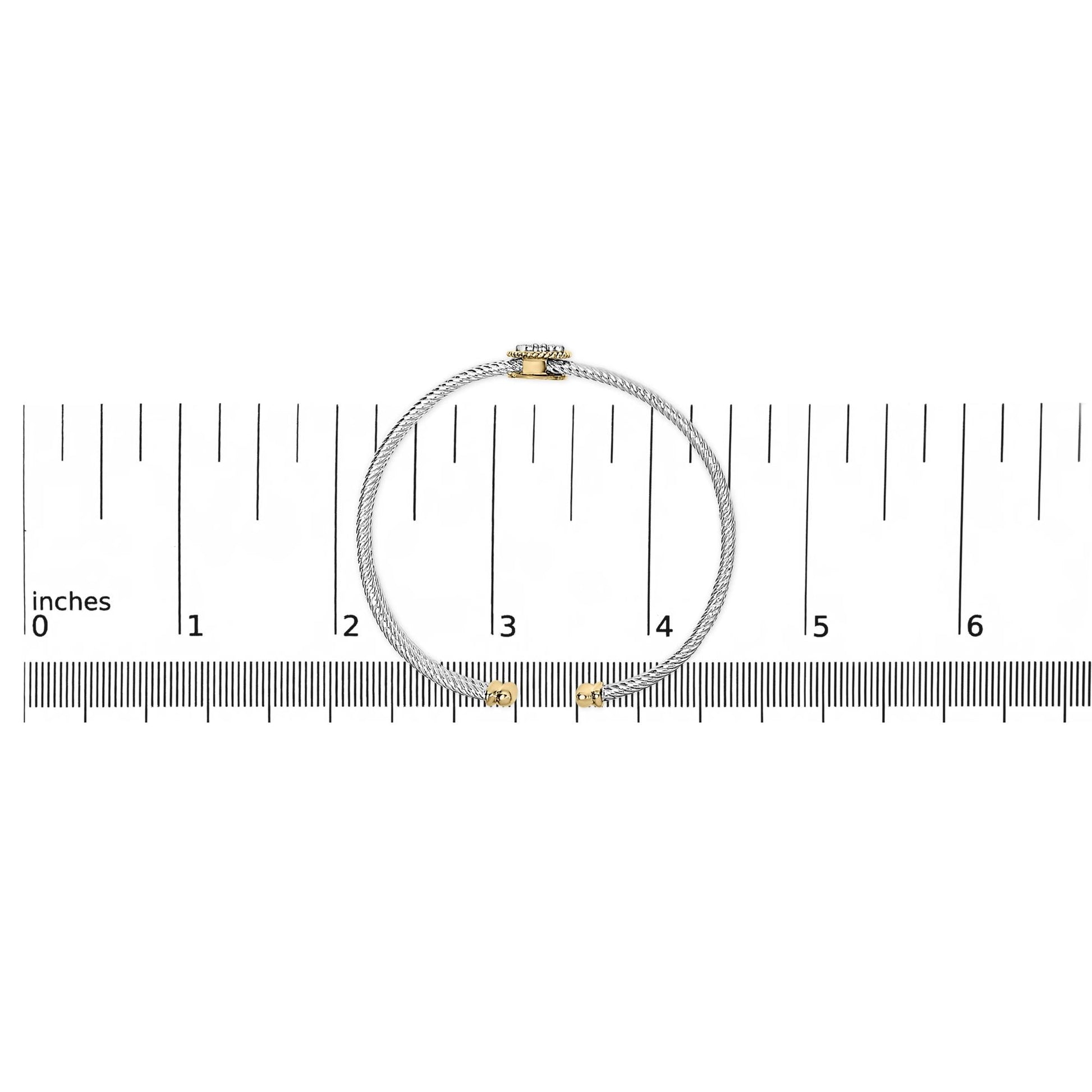 Enchant your senses with the ethereal beauty of our charming bracelet, where whimsy and elegance entwine. This exquisite piece is masterfully crafted from rhodium-plated .925 sterling silver, accented by 18K yellow gold that softly glimmers with every movement. At its heart lies a medallion, delicately adorned with natural diamonds, arranged thoughtfully to bring a dragonfly to life. Sparkles from the prong-set stones (I-J color, SI1-SI2 clarity) catch the eye, celebrating nature's fleeting beauty. The bangle’s twisted wire texture adds an intriguing dimensional contrast, while gold-plated caps on either end enhance its refined symmetry. Designed to gracefully encircle a wrist up to 7.75 inches, this bracelet promises not just to accessorize but to add a storytelling element to your finest moments.