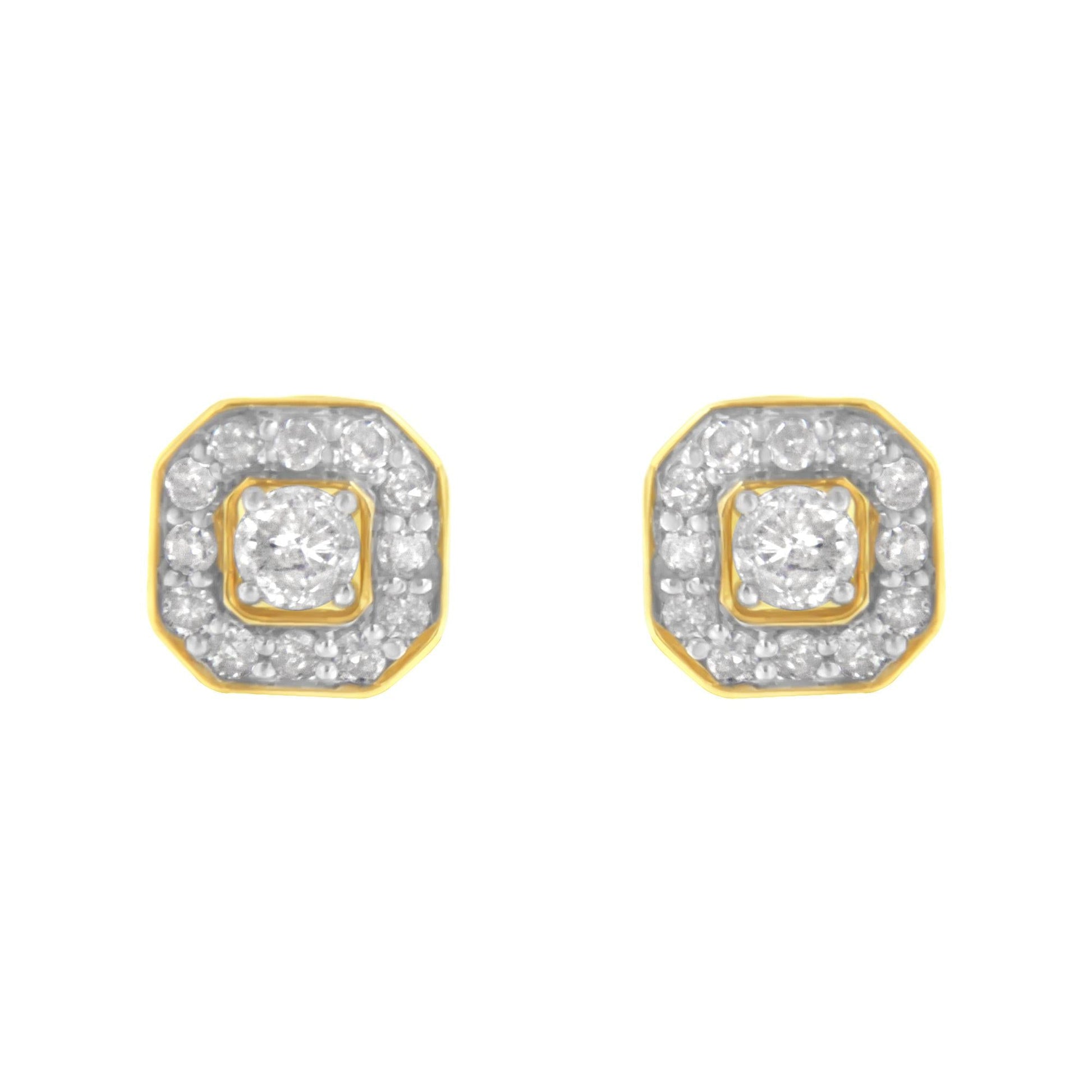 A pair of square diamond stud earrings that features central round brilliant cut diamonds surrounded by a squared halo of diamonds. Crafted in 2 Micron 10 karat yellow gold plated sterling silver, this elegant design has a total diamond weight of 1/2 carats.