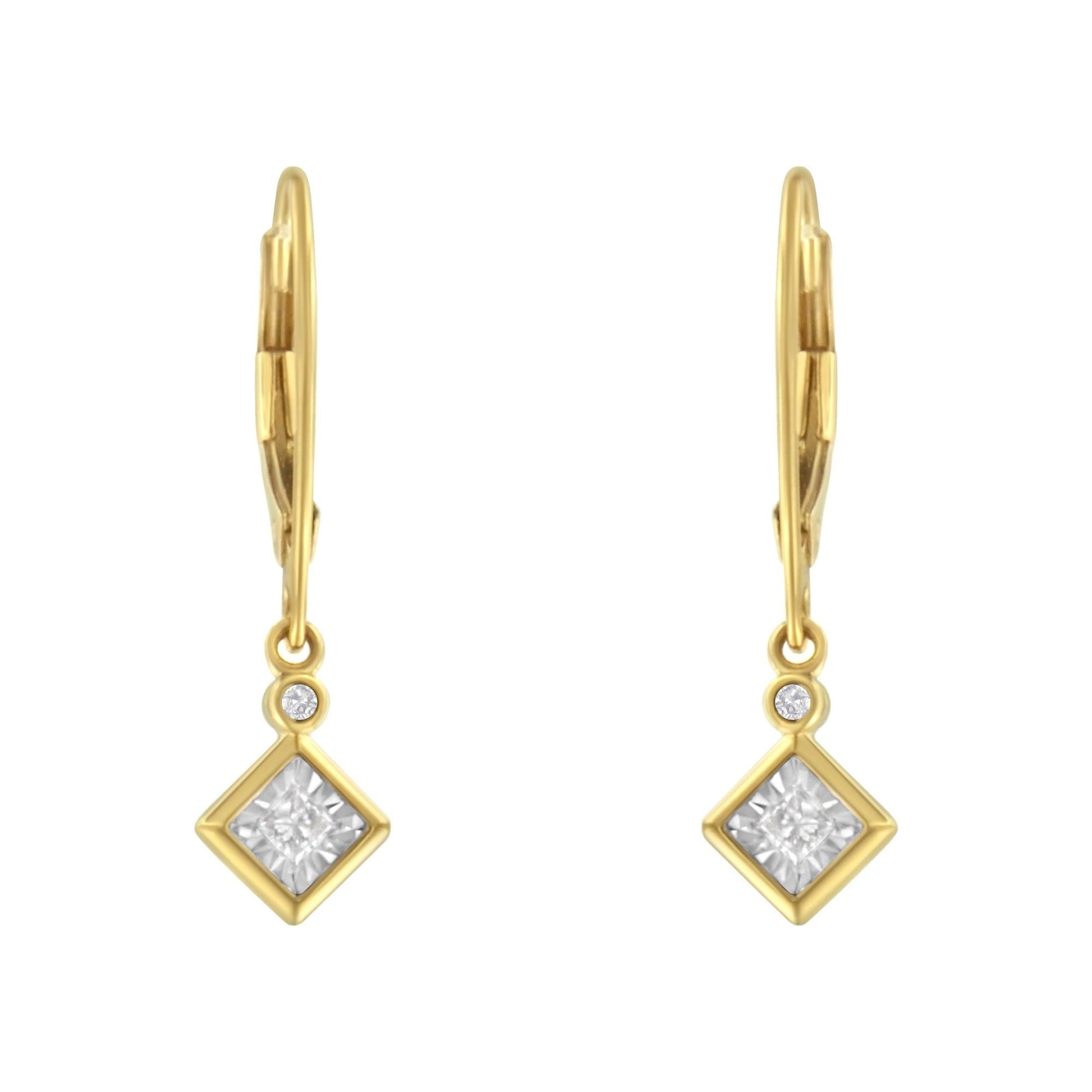 These lovely 14k yellow gold plated sterling silver dangle earrings feature 1/3ct of diamonds. A bezel set round diamond sits on top of a miracle set princess cut diamond. The small diamond design dangles from a lever back hook and adds the perfect amount of sparkle to your everyday wardrobe.