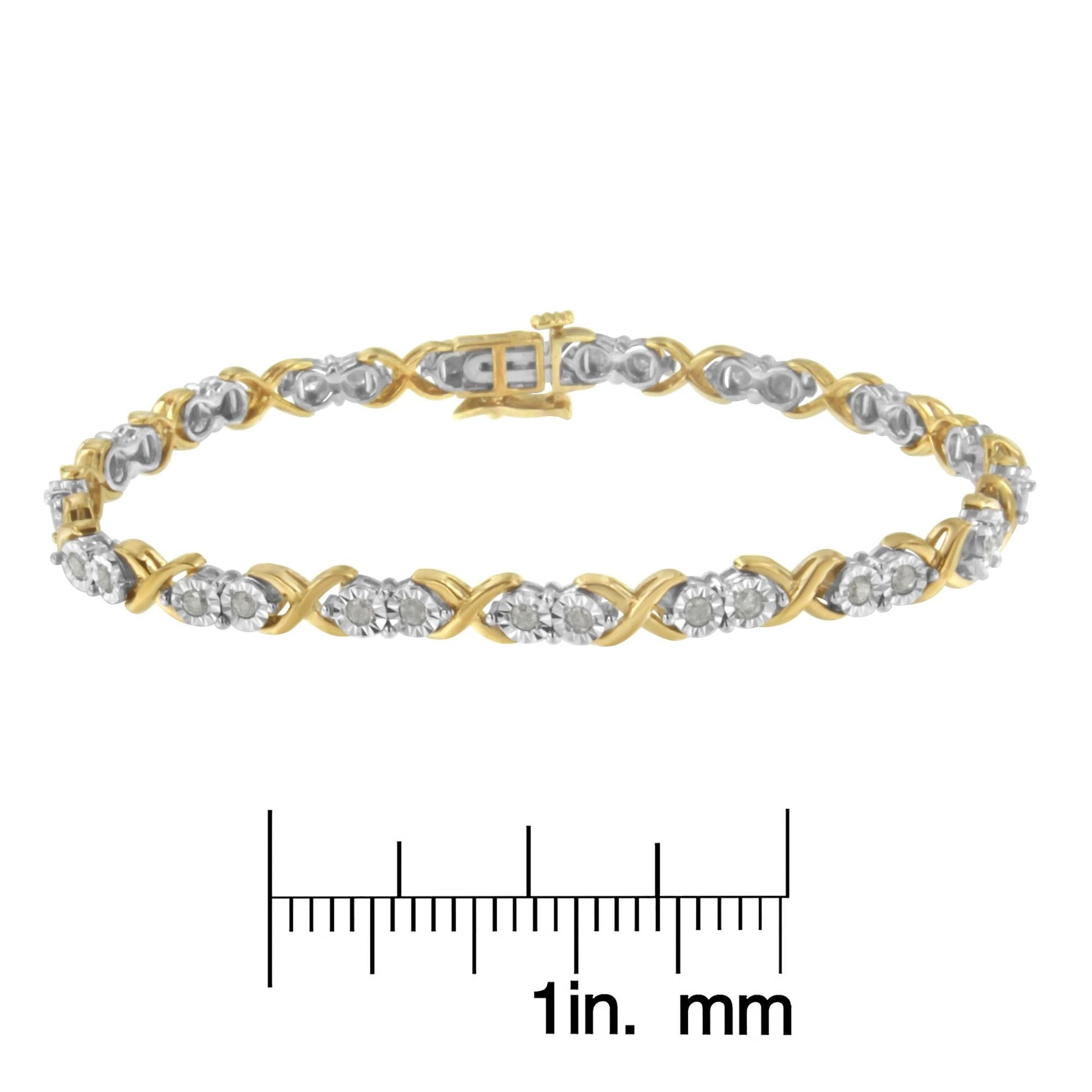 A yellow gold plated sterling silver x-link diamond bracelet that features an alternating design of an X-shaped link with double miracle set diamonds. The are 24 total diamonds with a total diamond weight of 1 carat. The diamonds are promo quality, which are on the lowest on the diamond color and quality scale. Round-cut, promo quality diamonds are milky and cloudy in nature. They have asymmetrical ball shape and are filled with inclusions.