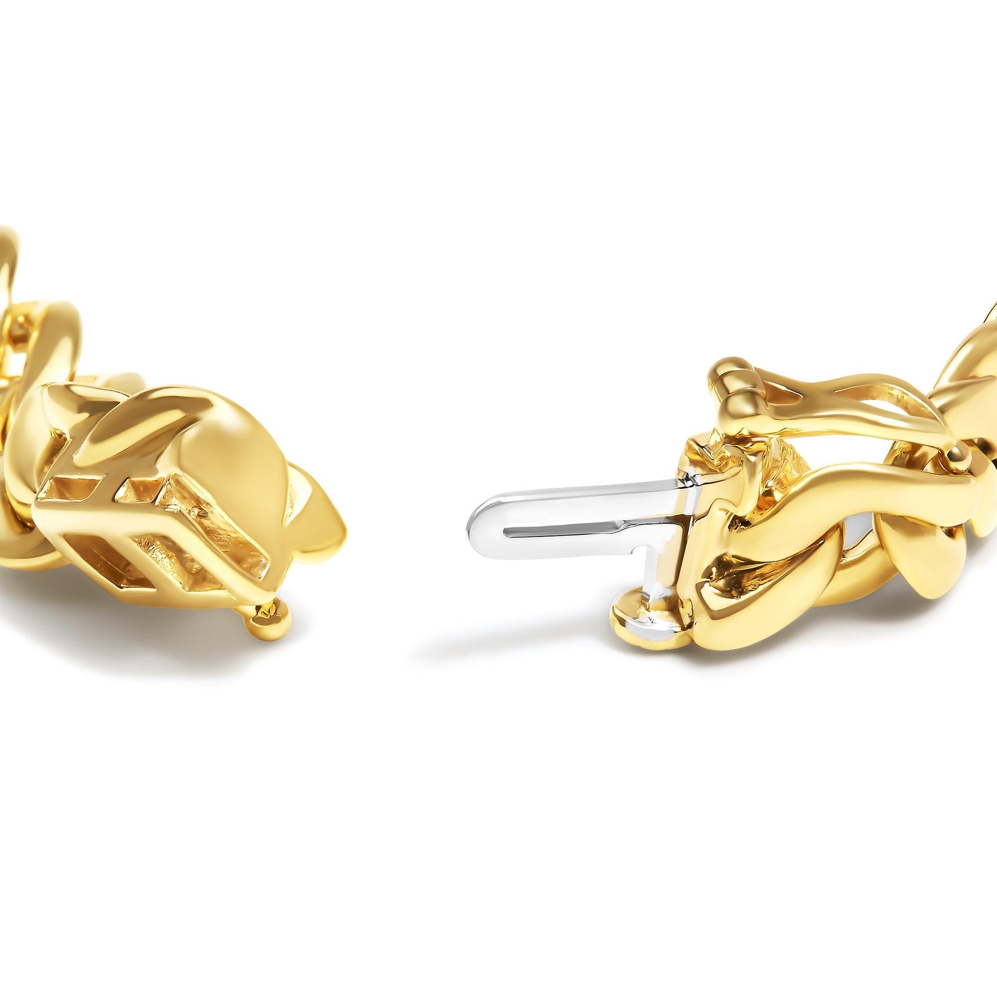 Encapsulate timeless elegance and spiritual symbolism with this exquisite 14K yellow gold-plated .925 sterling silver bracelet, designed for the discerning gentleman. Measuring 7.25 inches, this piece is intricately fashioned with a Cuban link, lending it a classic and robust charm. At its heart lies a resplendent yellow gold rectangle, embedded with natural diamonds arranged into a sublime sideway cross, sparkling in I-J color and I3 clarity, reflecting both your faith and refined taste. Secured with a sturdy box clasp and safety latch, this bracelet promises both style and security. A perfect blend of tradition and luxury, it suits any occasion and complements a lifestyle that appreciates a deep connection to personal beliefs and an unwavering commitment to sophistication.