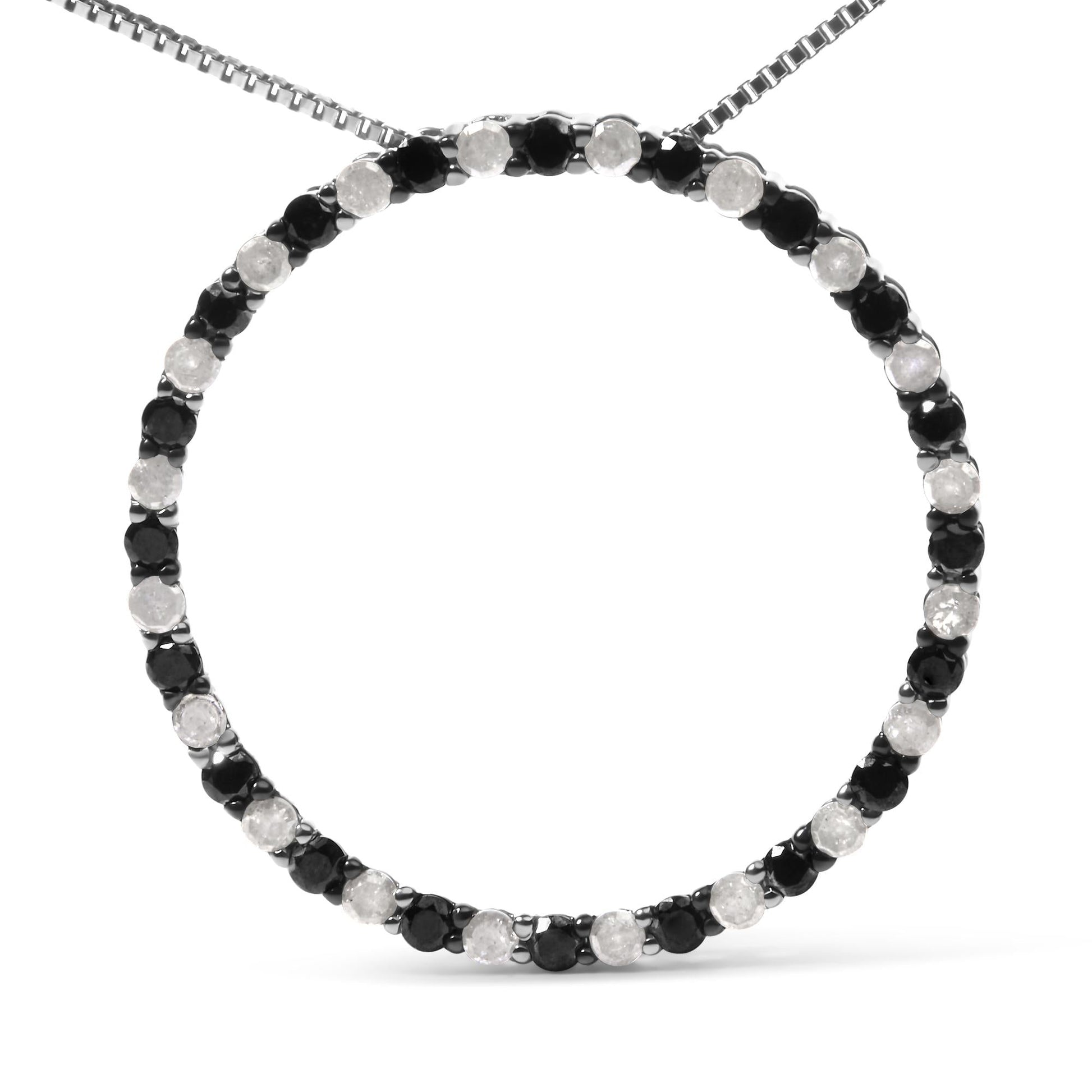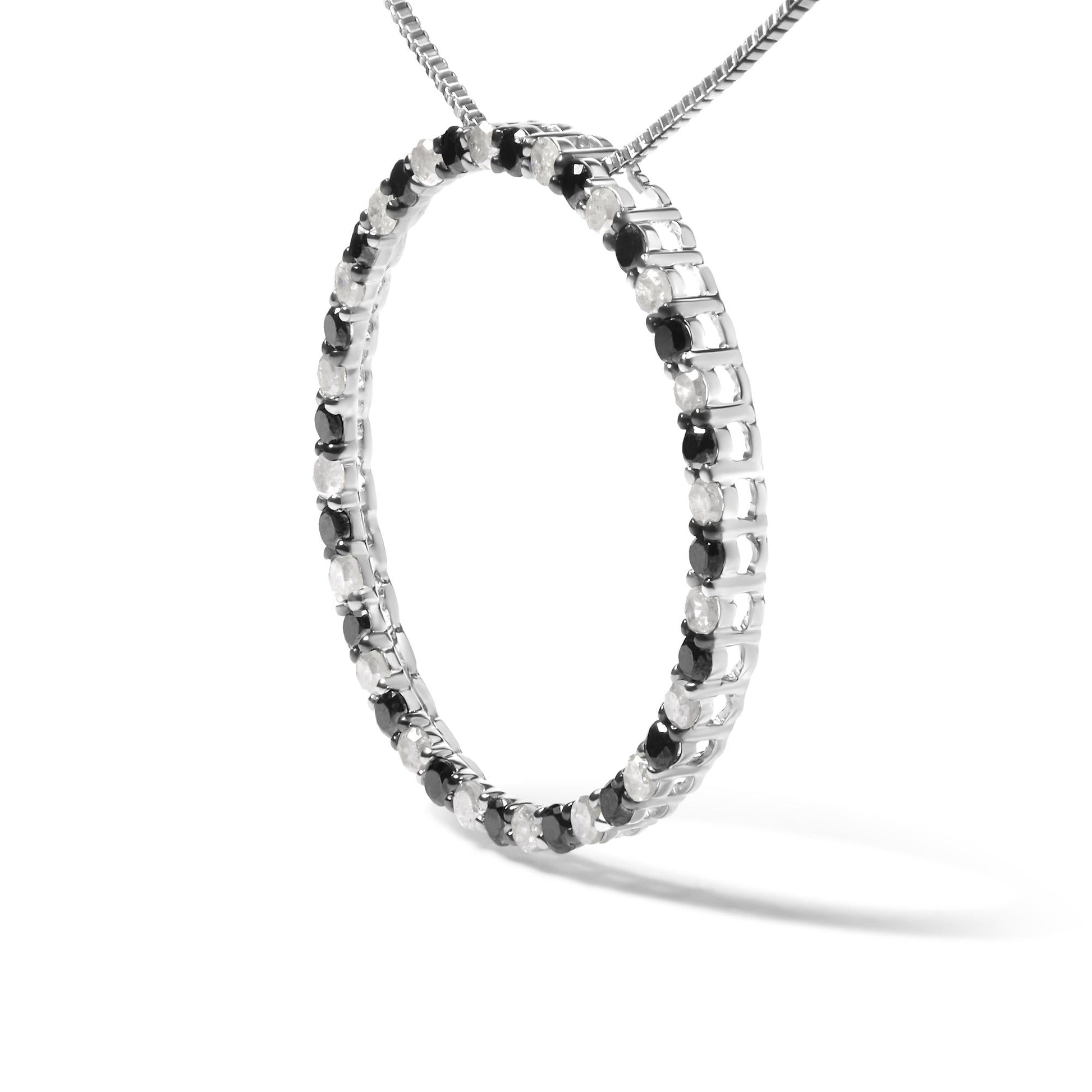 Experience the mesmerizing interplay of light and shadow with this exquisitely crafted pendant necklace, its open hoop circle a testament to timeless elegance. Forged from rhodium-plated .925 sterling silver, it showcases a series of alternating black and white diamonds, totaling a resplendent 1.0 carat. Each black diamond has undergone a color enhancement treatment to deepen its mystery, contrasting beautifully against the natural brilliance of the white diamonds. Suspended from an 18-inch box chain that closes with a secure spring ring clasp, this necklace is designed for both everyday charm and special occasion glamour. Its classic allure not only accents the neckline but also tells a story of sophistication and refined taste.